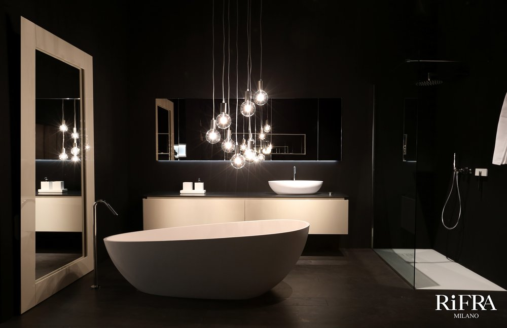 Finitura mobili isola e quinte: cemento nero spatolato a mano.