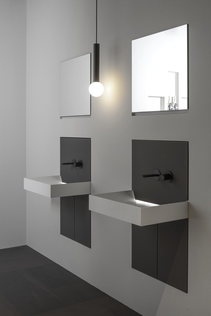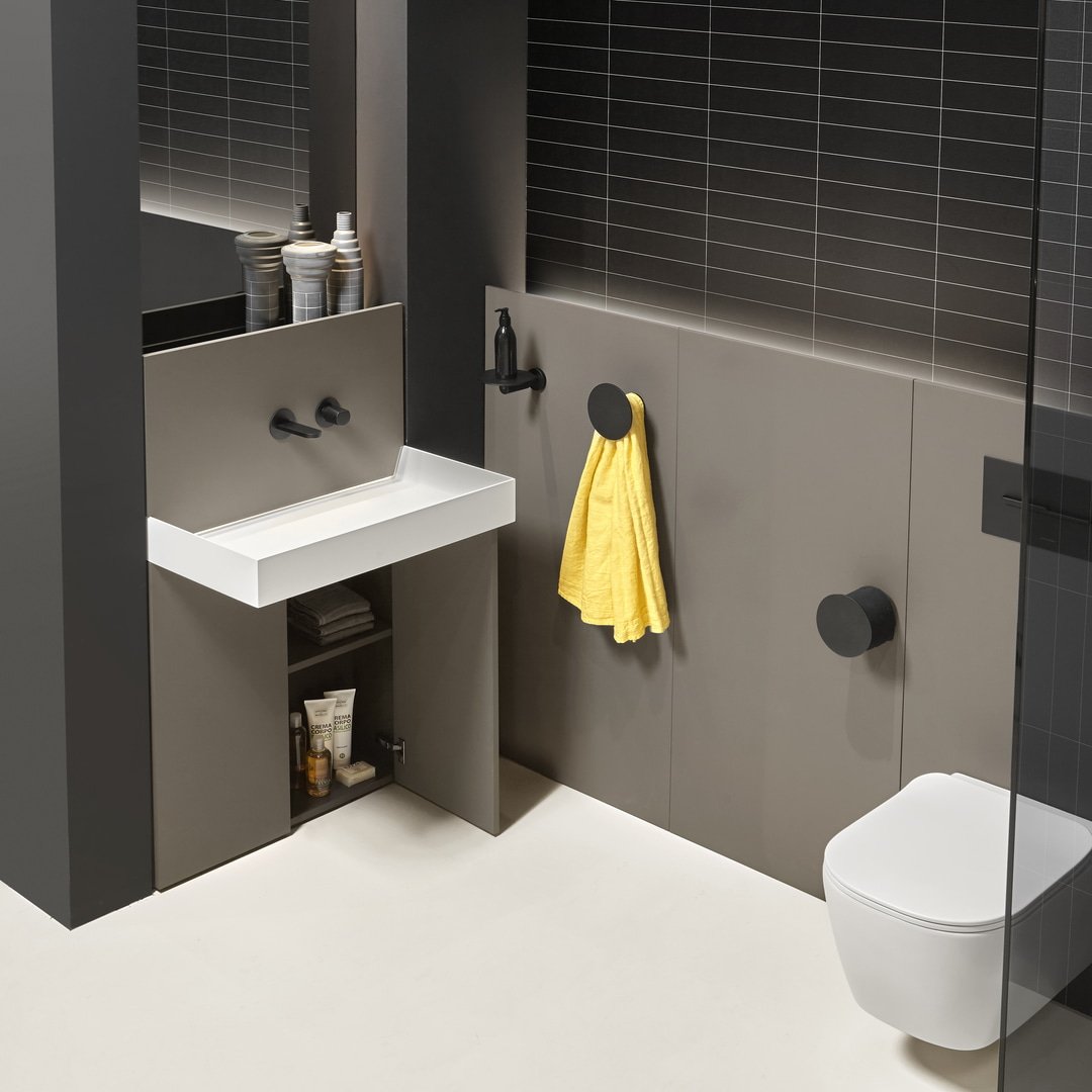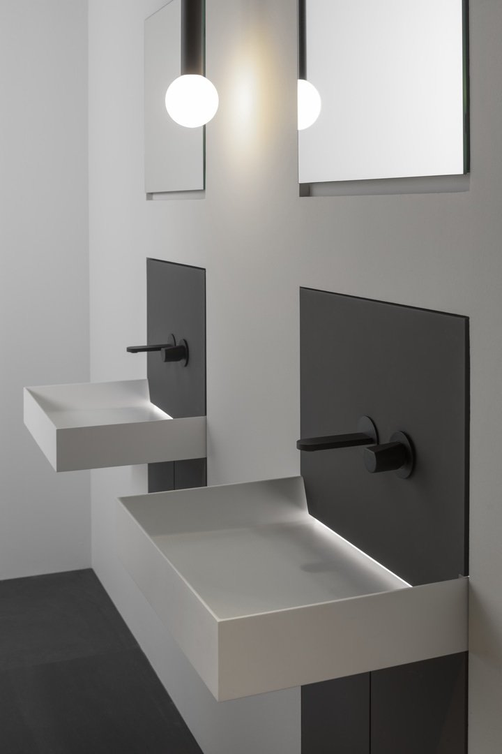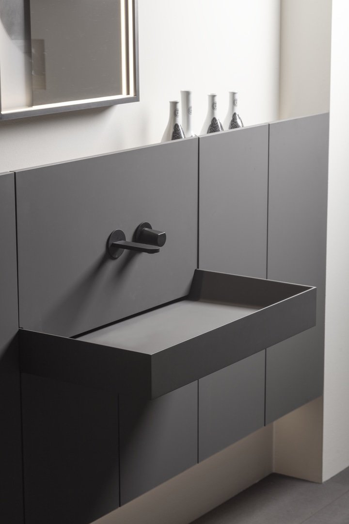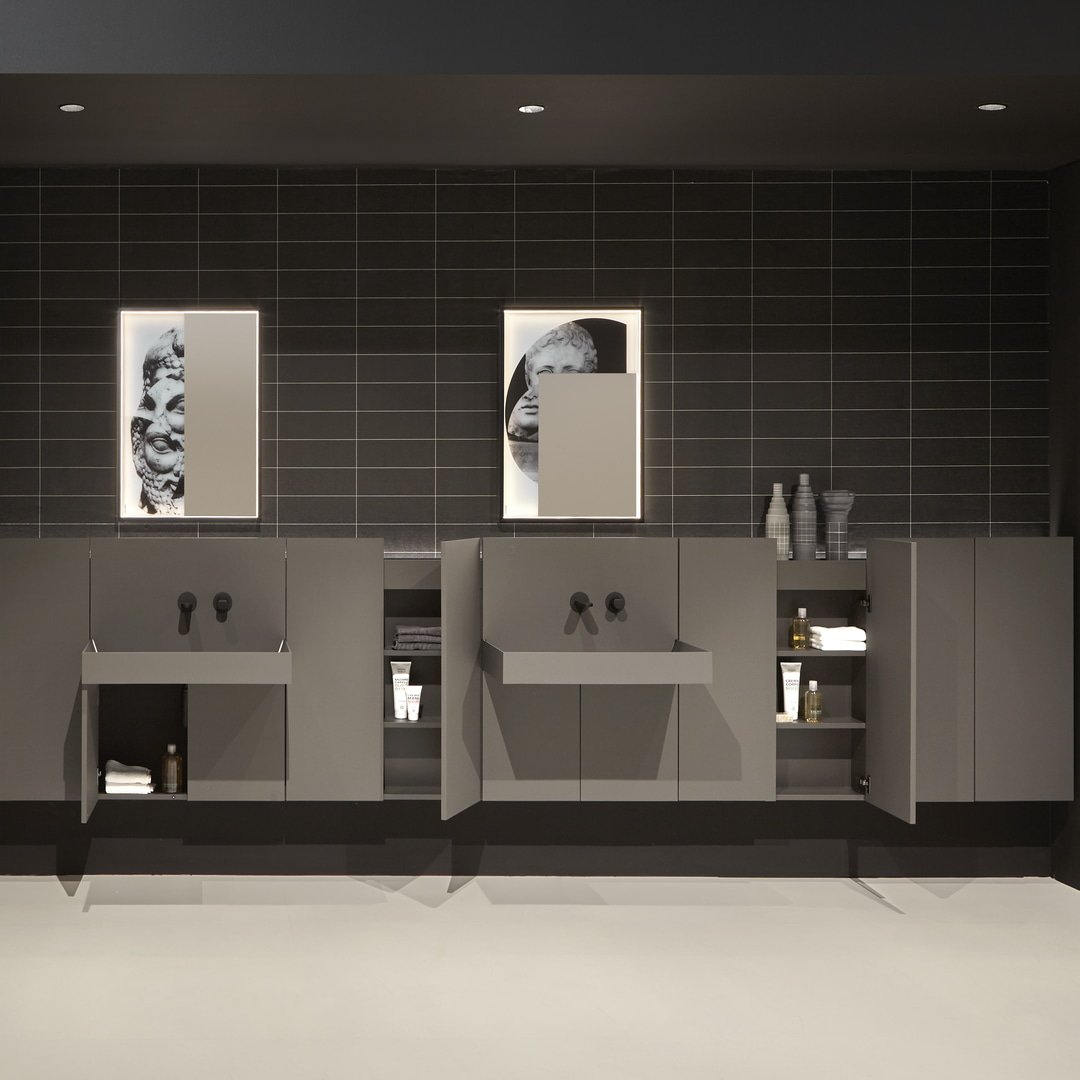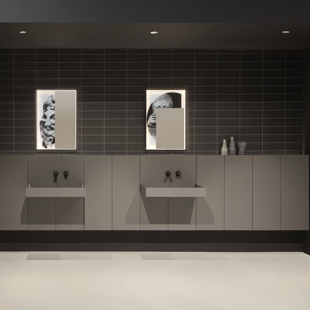 Oggi quel progetto si arricchisce di nuovi significati e valori, si trasforma rimanendo sé stesso, si predispone ad accogliere un nuovo racconto fatto di materia, superficie, accostamenti cromatici. Prende vita così un sistema che integra Strip con i mobili della collezione Anima Liquida per dare origine a Showdown, un protagonista dell’ambiente bagno in cui passato e presente si fondono per definire uno spazio dedicato e strutturato per accogliere al meglio tutte le funzioni dell’area lavabo. La dimensione orizzontale del lavabo incontra quella verticale dei moduli dei mobili definendo un fronte architettonico fatto di aggetti, sporgenze e rientri. Anima Liquida assicura la piena funzionalità al lavabo ospitando oggetti e accessori di uso quotidiano ma nascondendoli alla vista per preservare l’immagine pulita ed essenziale della composizione, arricchita dalle cromie e dalle sfumature uniche della pietra o del legno che diventano strumenti decorativi del progetto.