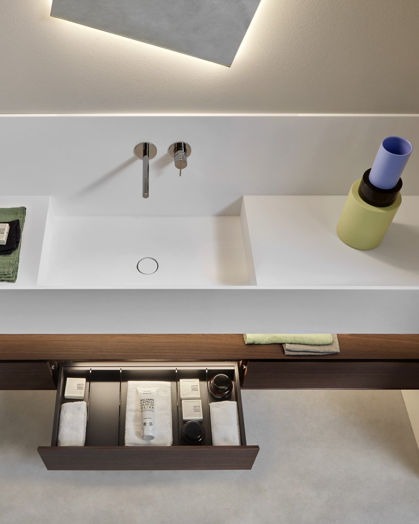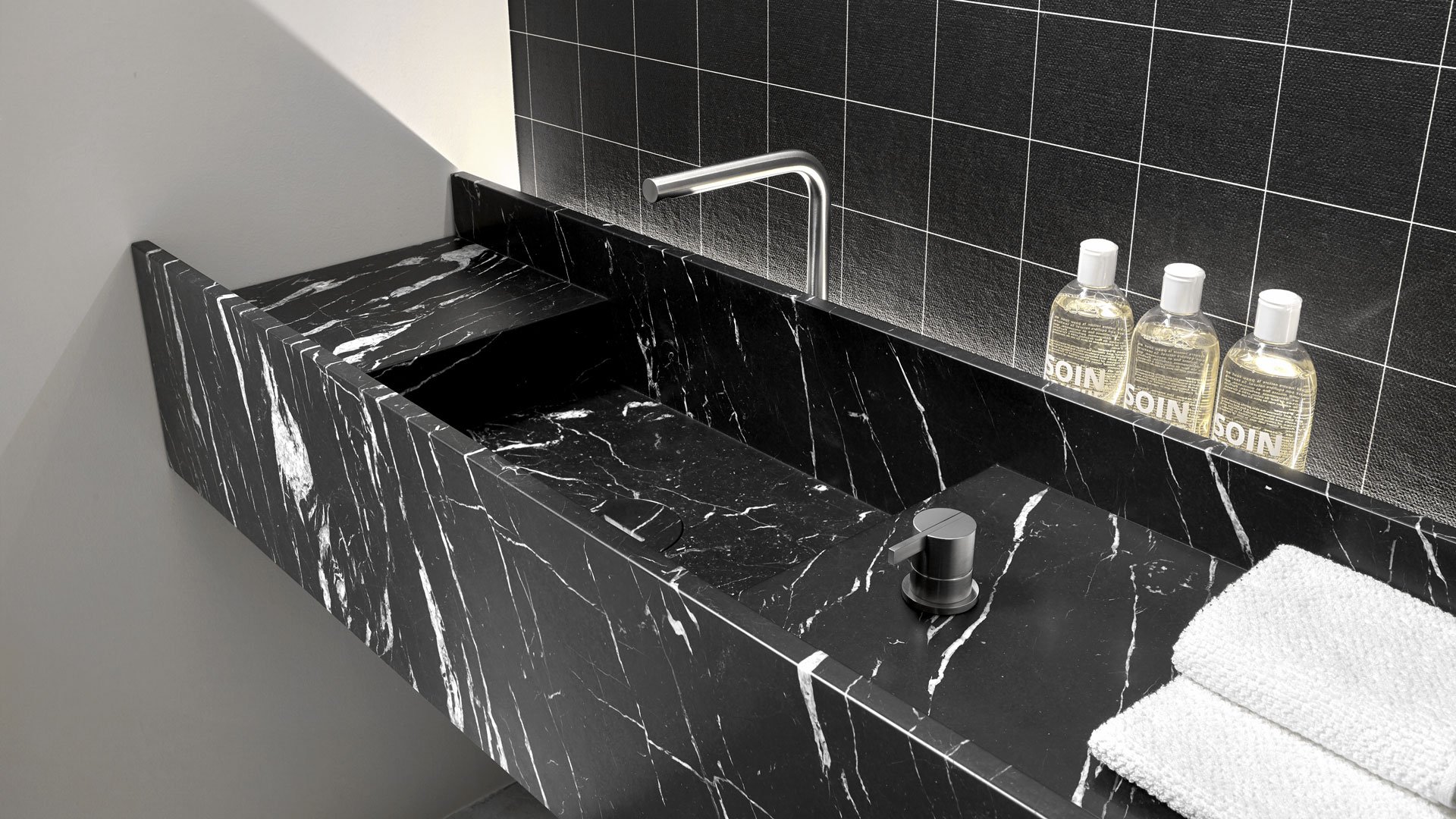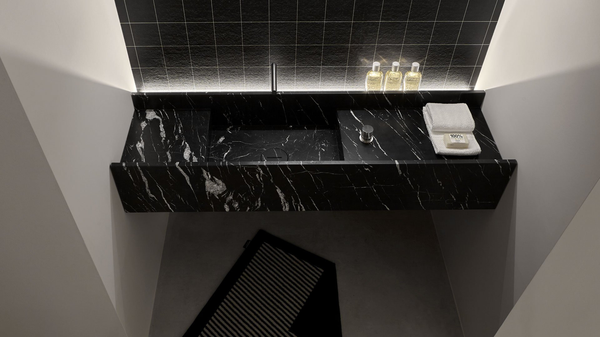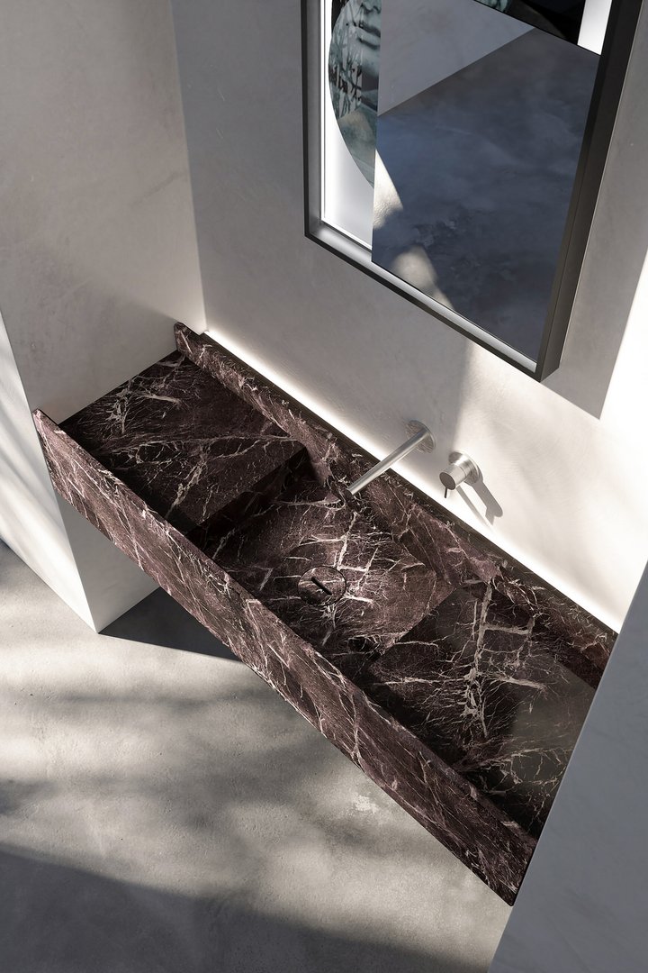 erfetto nella sua geometria rigorosa, contemporaneo nell’ortogonalità e nell’essenzialità delle linee impreziosite dalle infinite sfumature e variazioni cromatiche del marmo. Un lavabo che esprime al meglio la sartorialità di tutti i progetti antoniolupi, capaci di interpretare l’identità di ogni ambiente, di assecondare le esigenze dimensionali, di esprimere un’estetica sofisticata ed elegante. Due rette parallele disegnano lo spazio, definiscono lo spazio dell’acqua, due linee interrotte unicamente dai cambi di quota del top che danno vita alla sequenza ordinata e modulare di vasche e piani d’appoggio. Integrabile in nicchia o accostabile alla parete, nella versione con mobile o sospeso, identifica con pulizia formale ed eccellenza materica l’area lavabo.