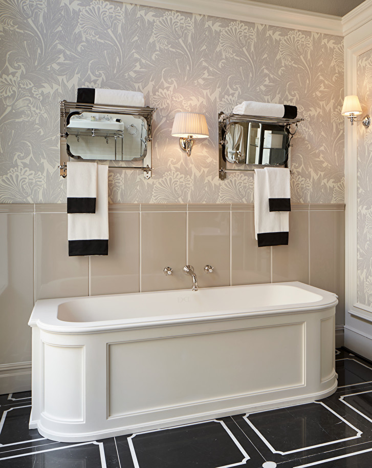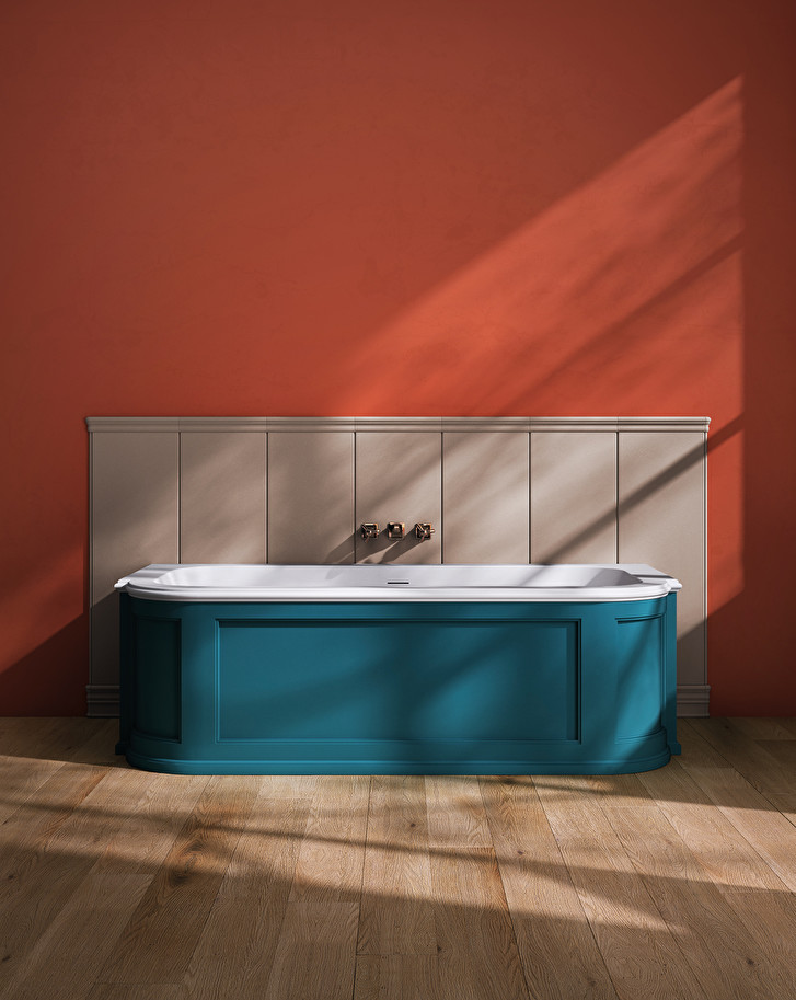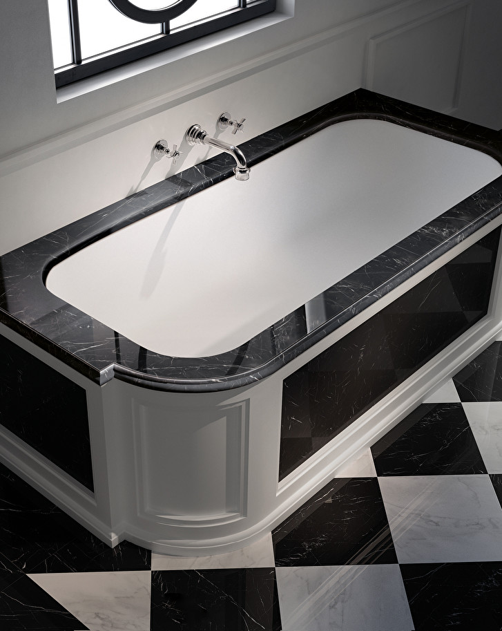 An impressive single-block bathtub in the neo-classic style with an explicitly prestigious character. Its sculptural elegance is emphasized by the rigorous geometrical designs of bas-reliefs. It is also available in a right or left corner version and can be enriched with precious decorative elements in white Carrara or black Marquina marble. The bathtub body is in White Tec, an innovative composite that guarantees excellent impact or mark strength and compliance with the highest standards in terms of quality and sustainability.