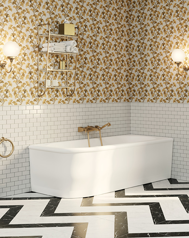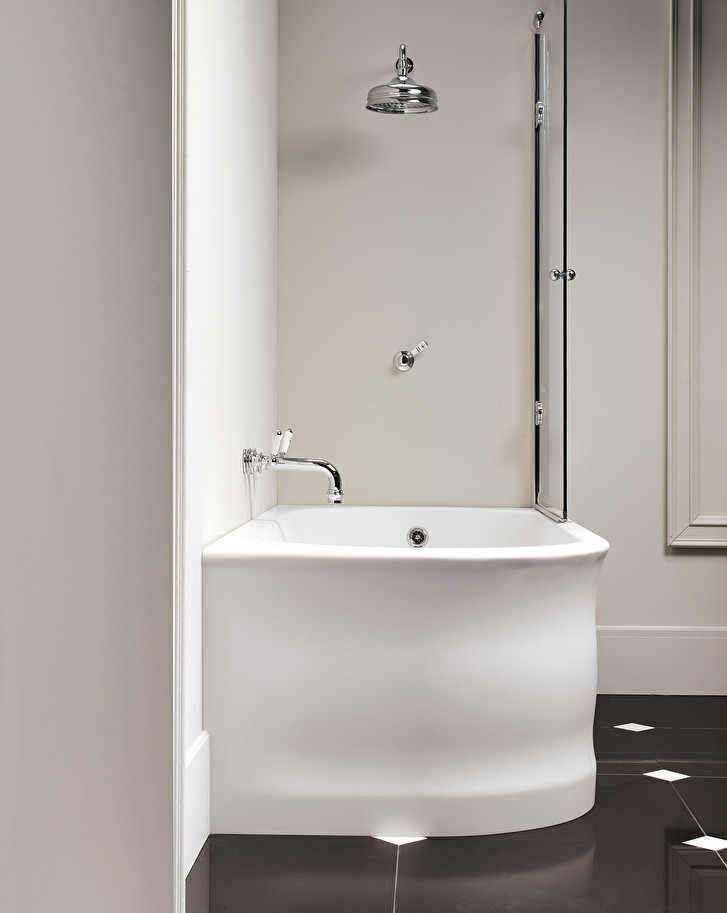 A White Tec corner bathtub whose design explicitly refers to the "important bathrooms" of the Fifties, revisited with innovative raw materials, while keeping their elegance and proportions unchanged. It is also available in the left corner version.