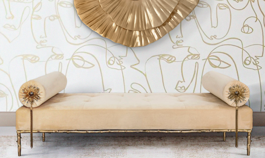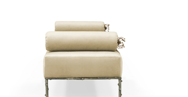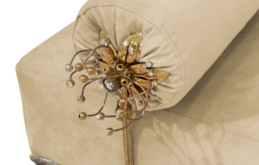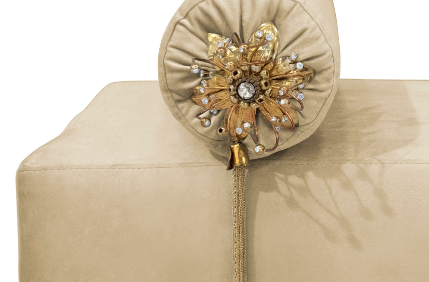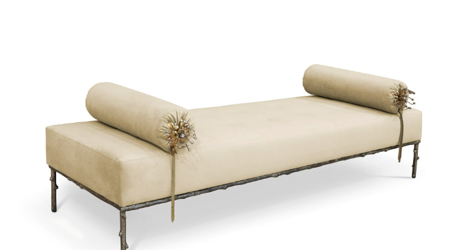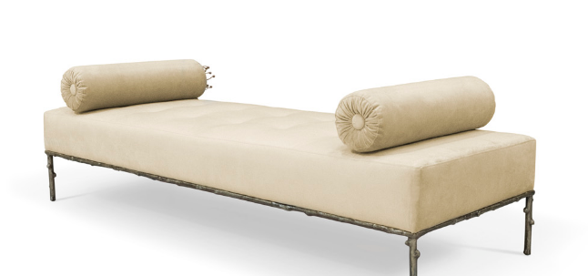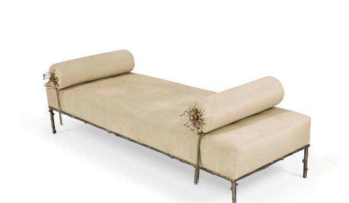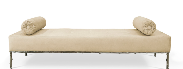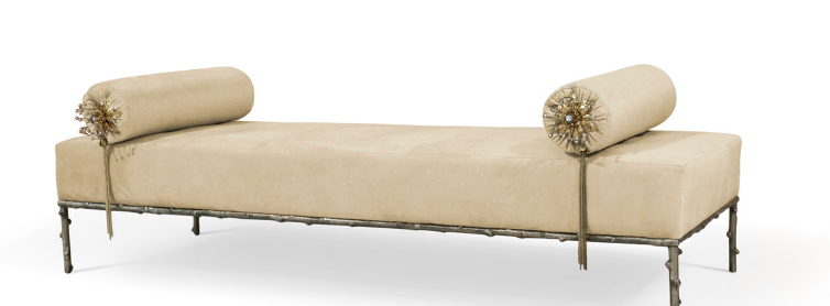 Not exactly flirtatious, but certainly not sweet, the Privê II Day Bed guarantees sensuous drama. Exquisite fora inspired details adorn this seductive piece. A delicate branch-like base, stunning bronze & crystal jeweled bolsters, and sumptuous soft tufting make this an utterly desirable piece.