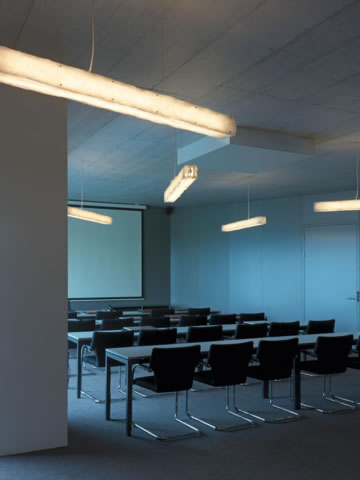The family of lights consists of a standing and floor lamp as well as three suspension versions. With its energy-saving lamps and perfect anti-glare properties, these lights are ideal not only for the dining room table but also for office workplaces. The suspension lights are available in two lengths and seven wattages with an additional XL version available towards the end of 2010. The light is particularly useful for rooms with high ceilings with dining or conference tables in them and also for reception desks.