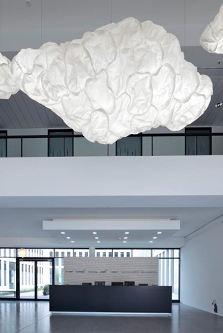 Their poetic character and great variety transform the fair-weather belux mamacloud, into an atmospheric light sculpture. Its durable high-tech material can be sculptured to make each light unique. Standard lengths range up to 7m – with other forms and sizes individually made. The voluminous lamp is suitable for large rooms and has sound-softening features. The material is a multirefined polyester fleece which is virtually tear-proof, resistant to ageing and is almost nonflammable.