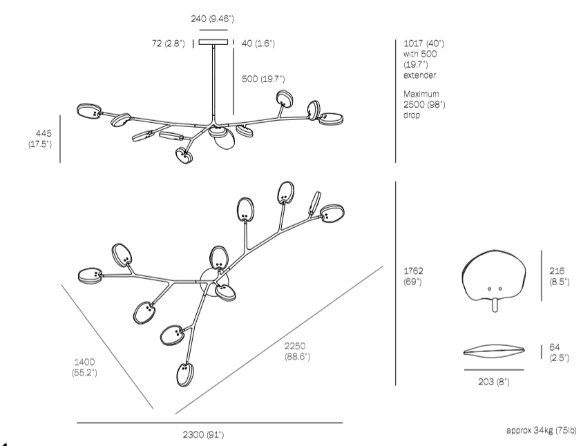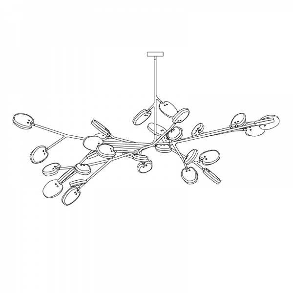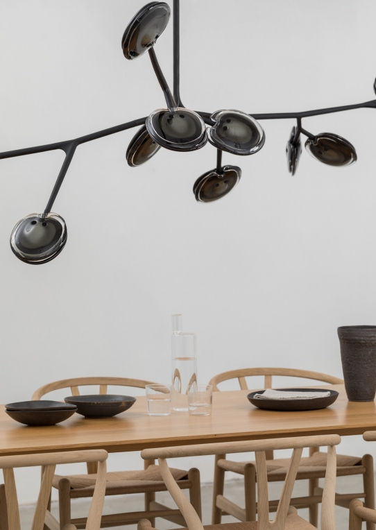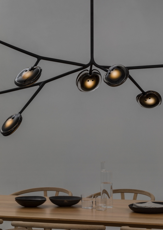 A stainless steel armature system in a soft-touch matte black finish allows pre-composed branches to be easily connected to a series of hubs during installation.