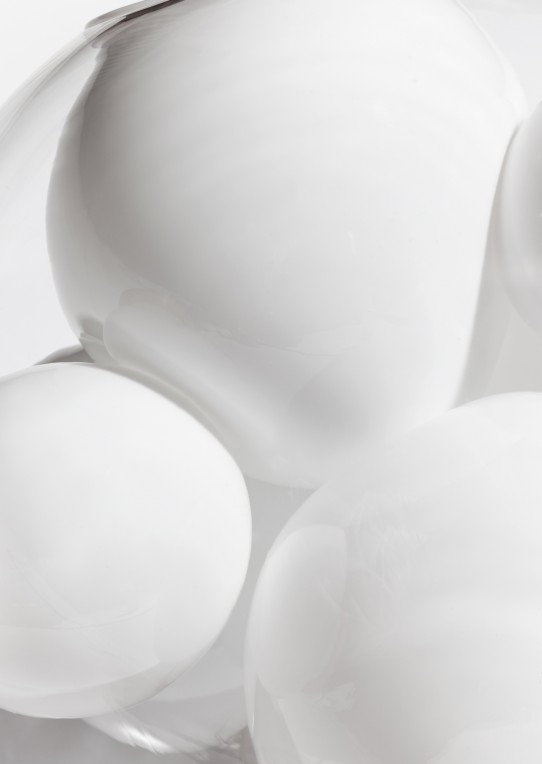 38 pushes the fabrication technique originally developed for 28 to its technical and material limits. A large glass sphere is blown with a multitude of haphazard interior cavities, which intersect and collide with each other in unpredictable ways. Several of these satellite cavities are deep enough to hold earth and succulent or cacti plantings, while others house lighting elements. Each 38 contains two or three lighting elements per large sphere, housing either a 10-watt xenon or a 1.5-watt LED lamp, and one or two planters.