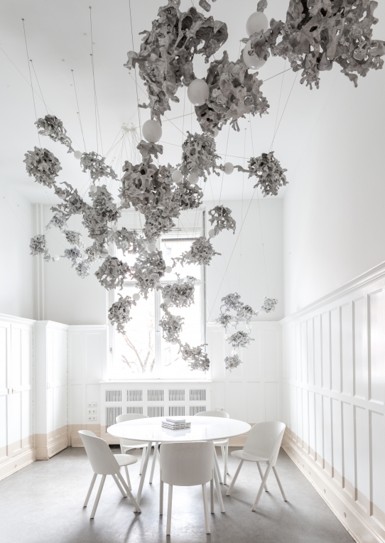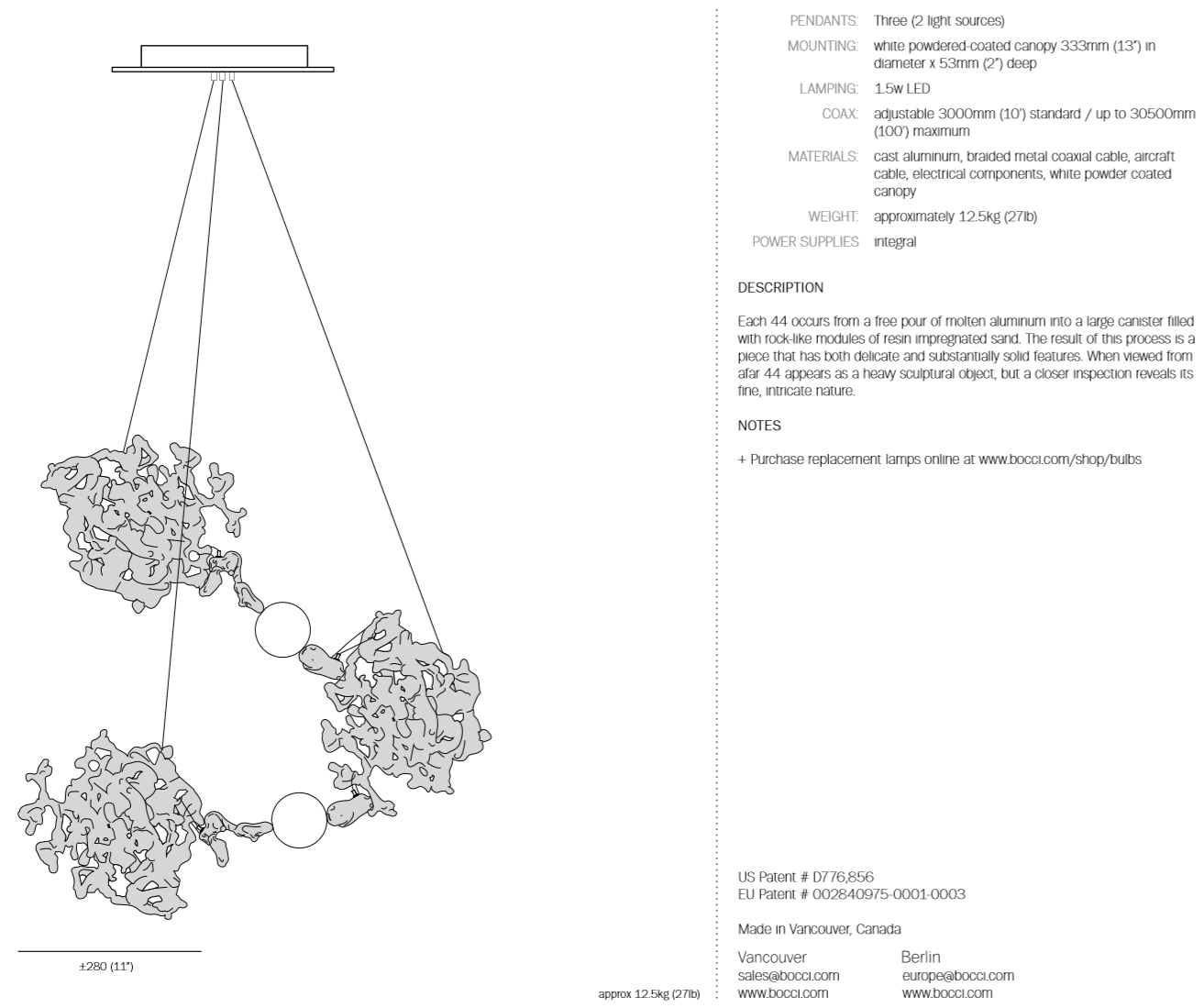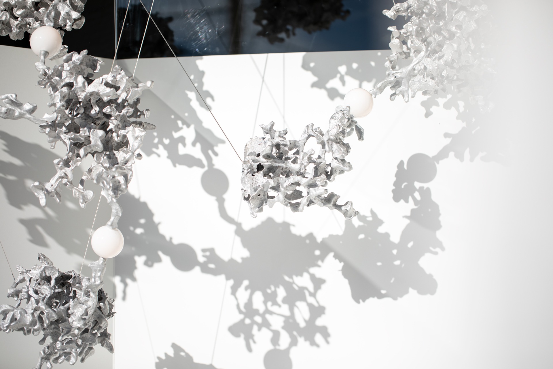 Each 44 results from a free pour of molten aluminium into a large canister filled with rock-like modules of resin-impregnated sand, a waste product of conventional sand casting. Low voltage electricity is transmitted through the castings, allowing a light source to be suspended between them without using cables.