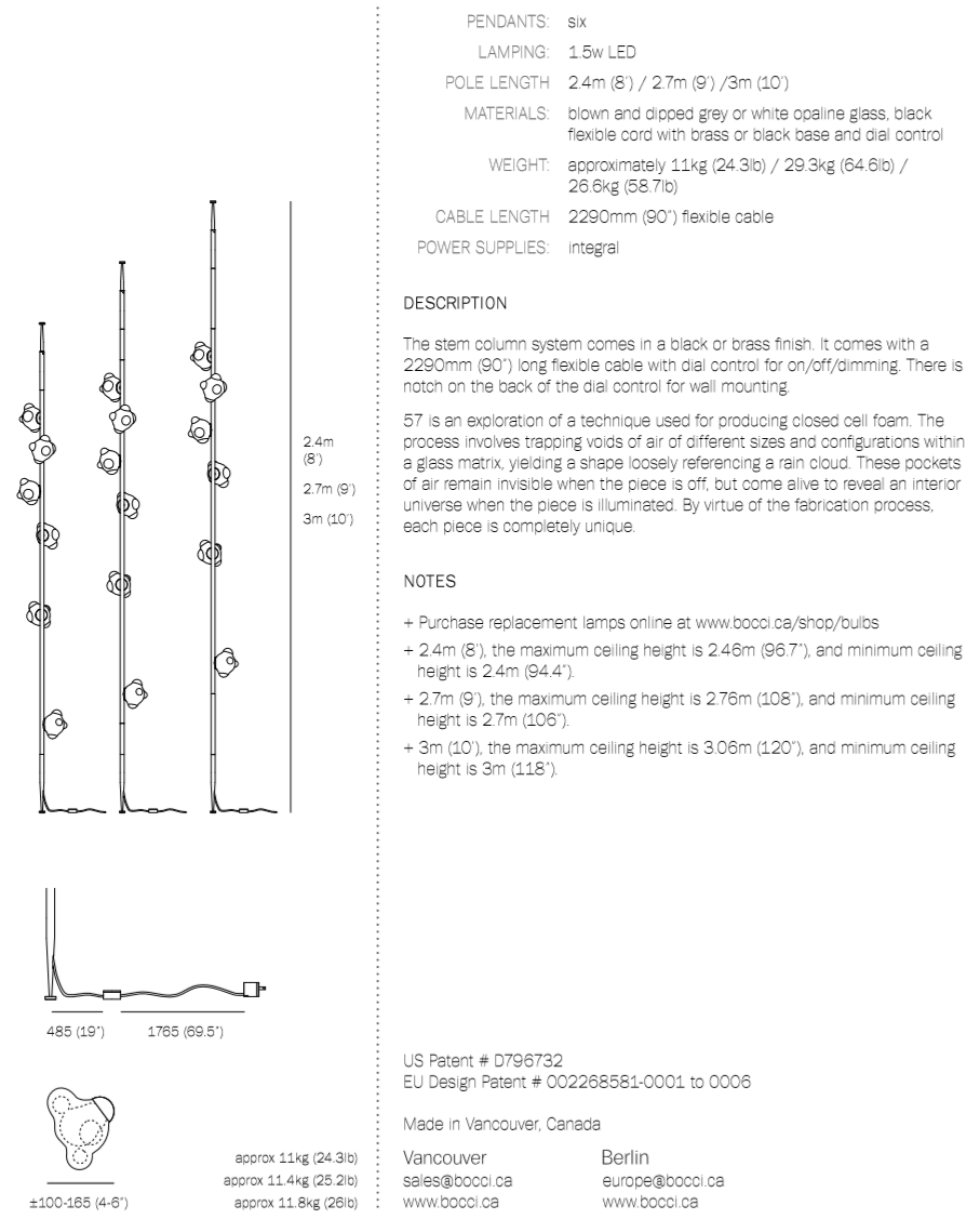 The 57 series stem column system comes in a brass or black finish, two different configurations and multiple height options. The spring loaded spike system allows for both vertical and angled installation. The semi-rigid black fabric cord includes a patented integral 360 degree dimming system housed within a sleek brass cylinder.