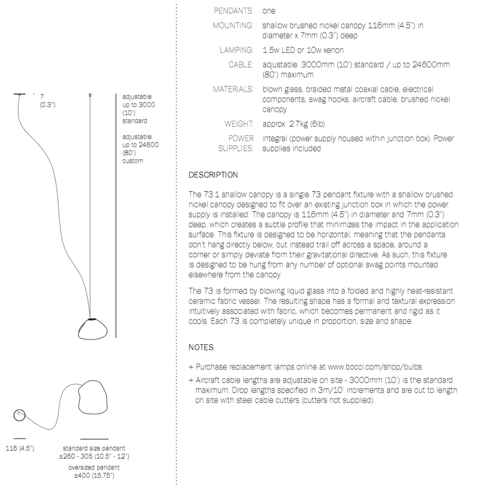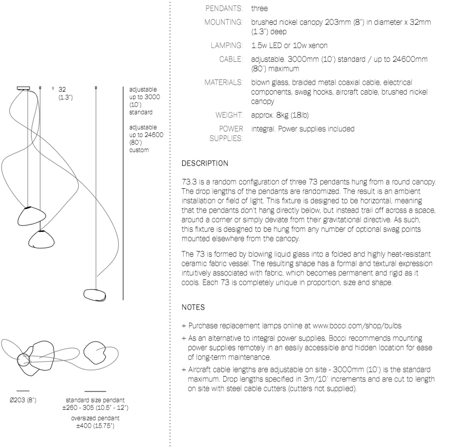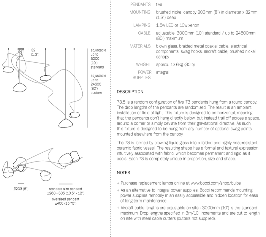 The 73 semi-rigid is a flexible suspension system enables pendants to be nestled in close-knit groups or loosely composed in a wider field, allowing each piece to be perceived individually.