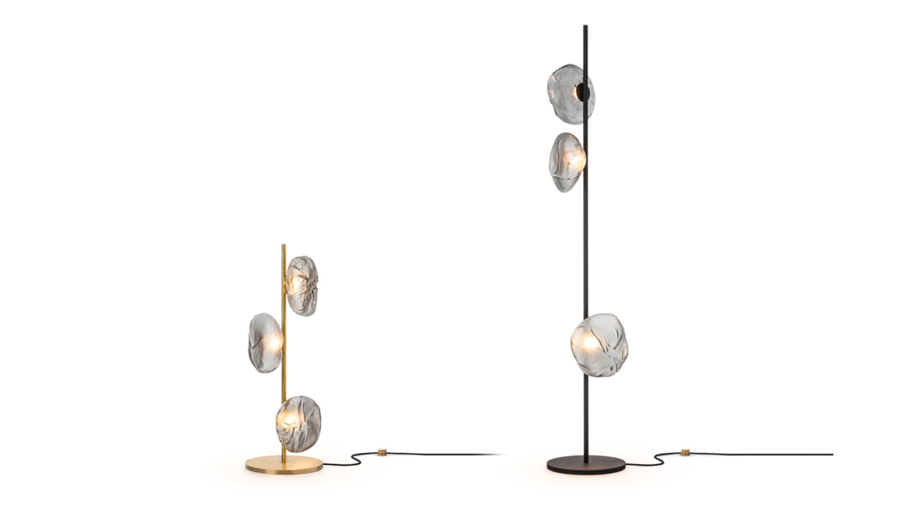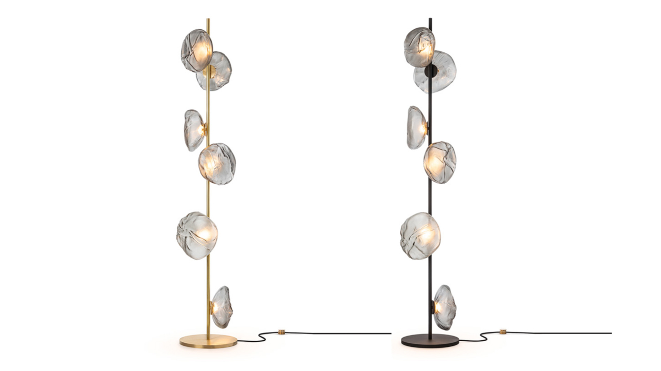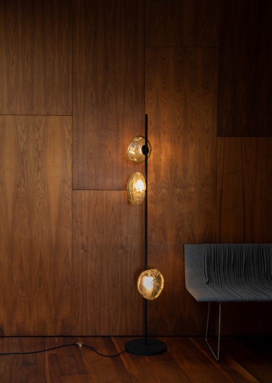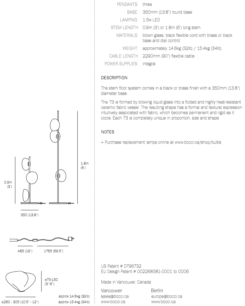 The 73 series stem floor system comes in a brass or black finish and three different configurations. The semi-rigid black fabric cord includes a patented integral 360 degree dimming system housed within a sleek brass cylinder.