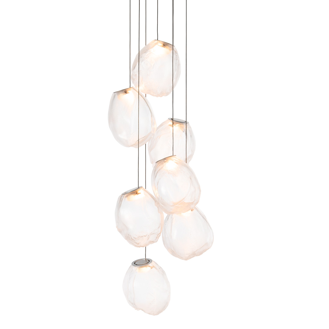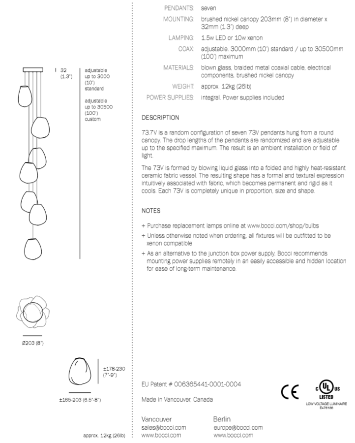 73.7V is a low voltage arrangement of 7 blown-glass pendants. Each pendant is hand blown into a folded and highly heat-resistant ceramic fabric vessel. Each pendant is housed with a 10 watt xenon or 1.5 watt LED lamp.