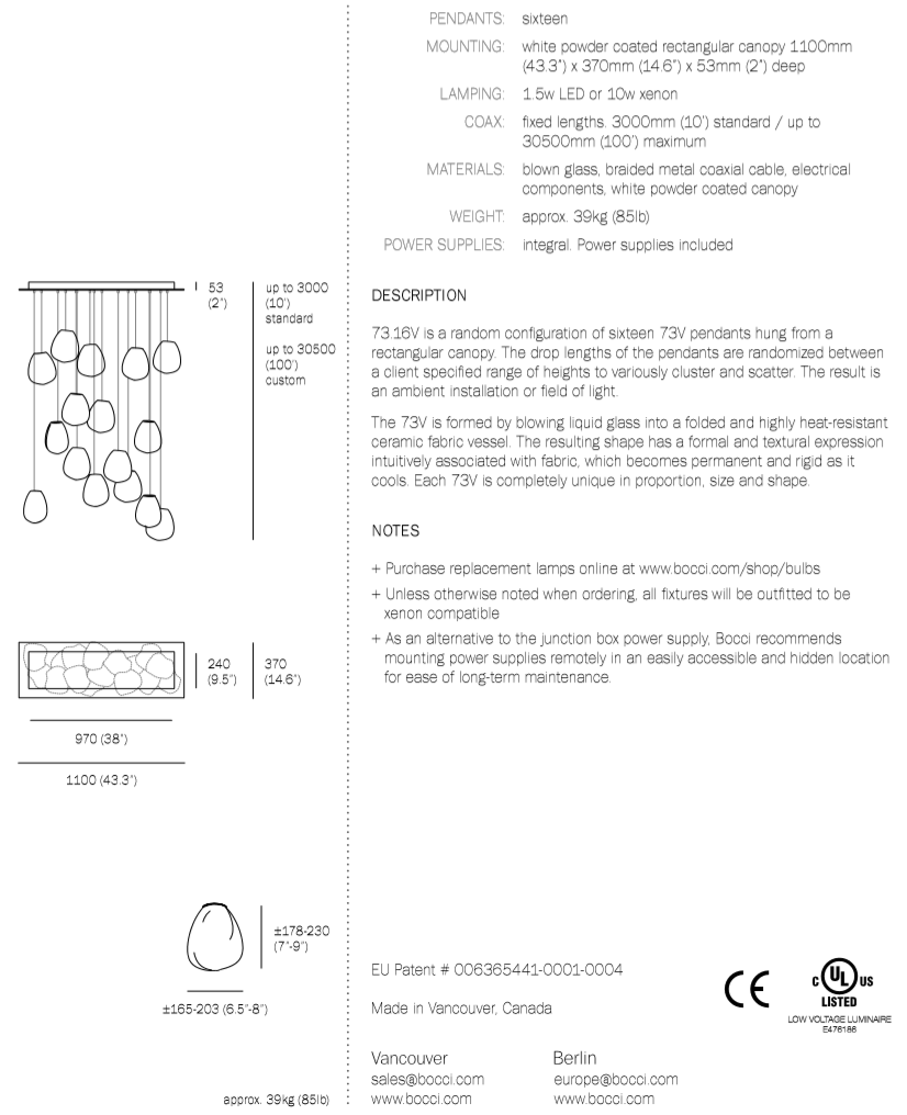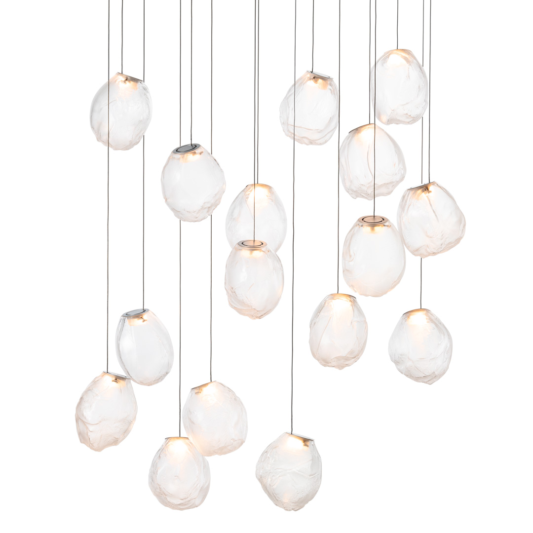 73.16V is a low voltage arrangement of 16 blown-glass pendants. Each pendant is hand blown into a folded and highly heat-resistant ceramic fabric vessel. Each pendant is housed with a 10 watt xenon or 1.5 watt LED lamp.