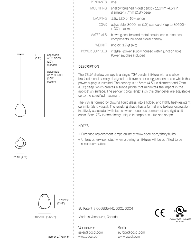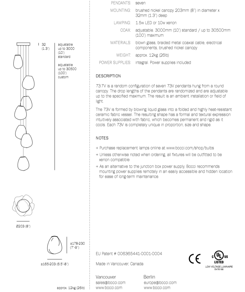 73V is an expansion of the technique used to create Bocci’s popular 73 series. The new pendant features a novel oblong shape and gradient colour range. 73V results from blowing molten glass into a folded, heat-resistant ceramic fabric. The resulting shape has a formal and textural expression intuitively associated with fabric, which becomes permanent as it cools. A light source is positioned at the top of each pendant, accentuating the volumetric perception of the piece as well as the gradation of colour.