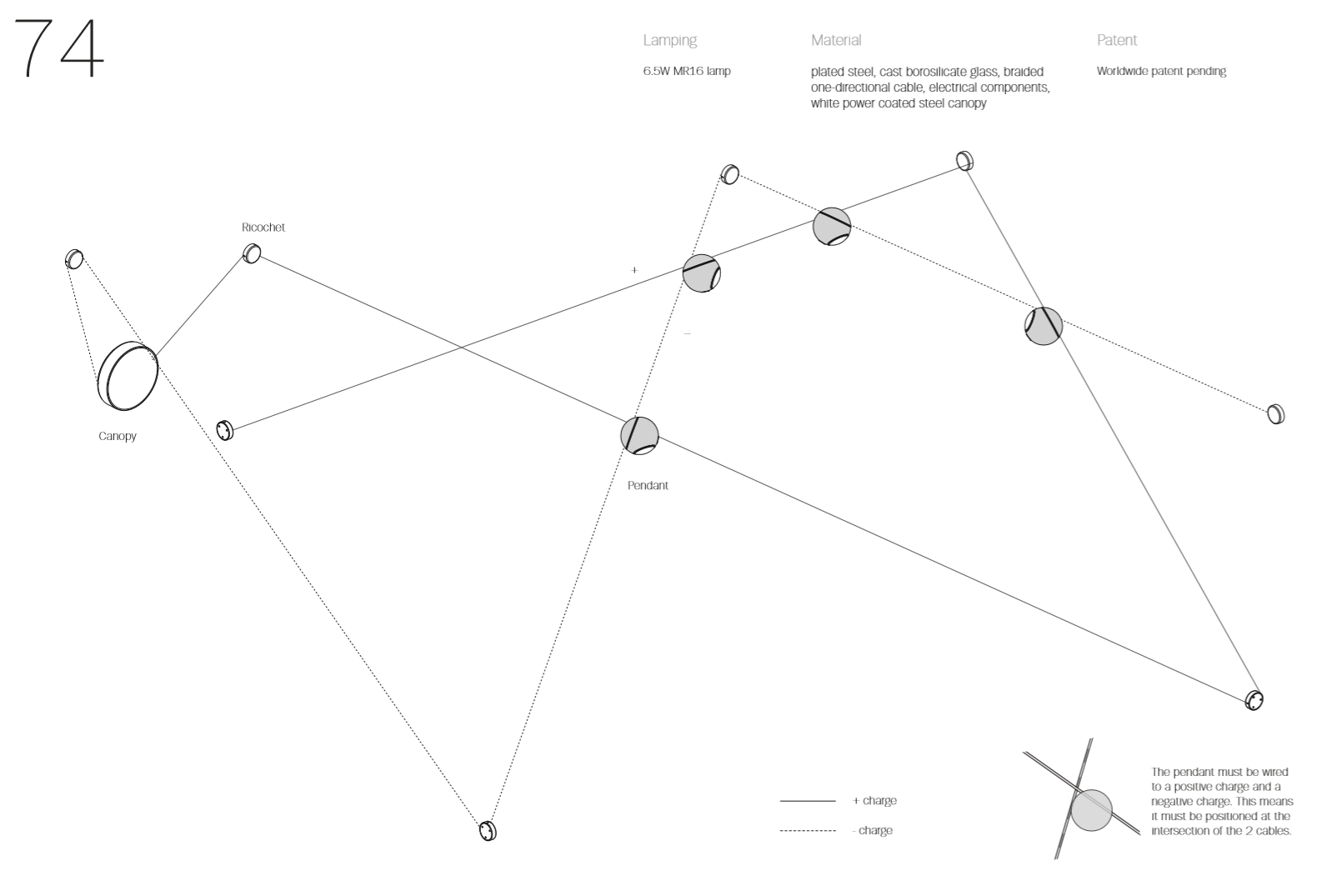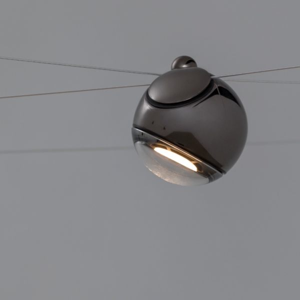 74 is a new LED spotlighting system designed as an alternative to conventional track lighting. The spotlights are housed inside articulated mirrored spheres that are affixed with a magnet, allowing maximum control over the emitted cone of light. Low voltage electricity passes through delicate coaxial cables freely composed in three–dimensional space, with the adjustable spheres located at certain intersections.
