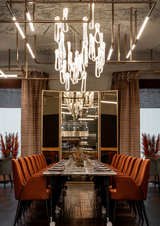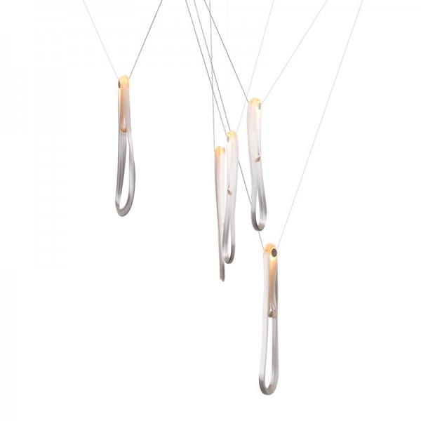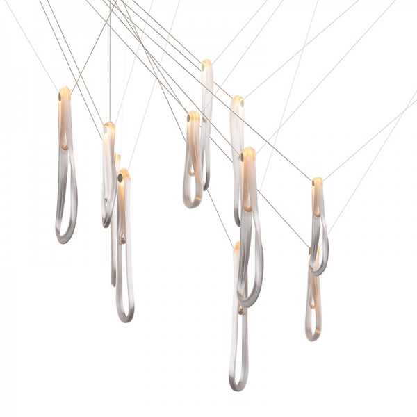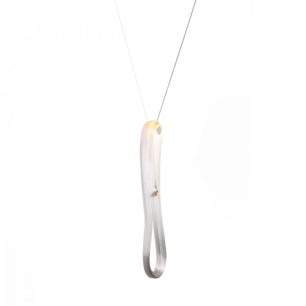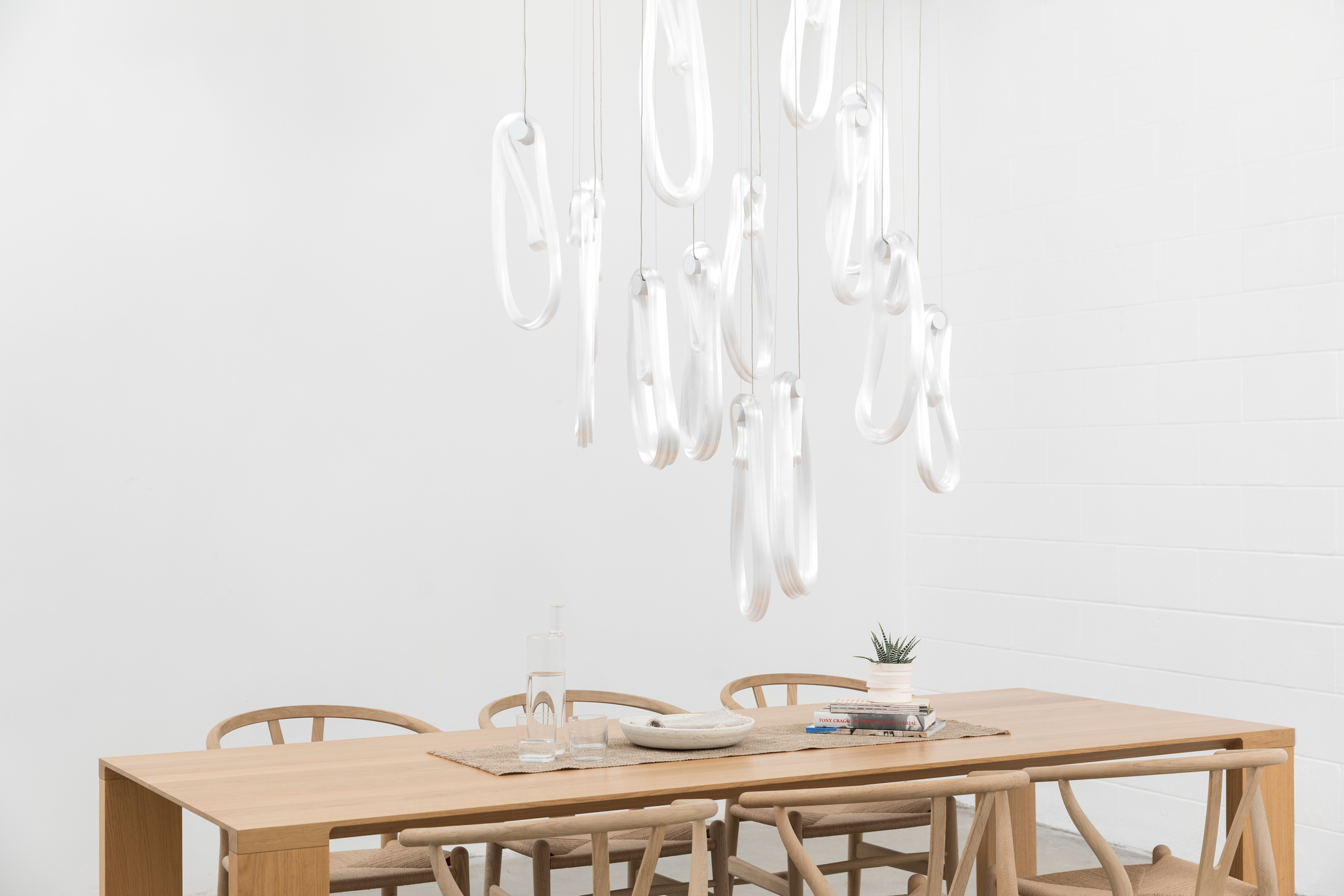 Soda water is used to trap air in a super heated glass matrix, which is vertically stretched and folded back onto itself between pegs numerous times. As the glass cools, the folding motion along the grain of the loop turns the entrapped air into microfilaments that give the piece a pearlescent optical quality. A low-voltage xenon or LED light source is introduced at one end of the loop casting light through the microfilaments and registering a gentle gradient.