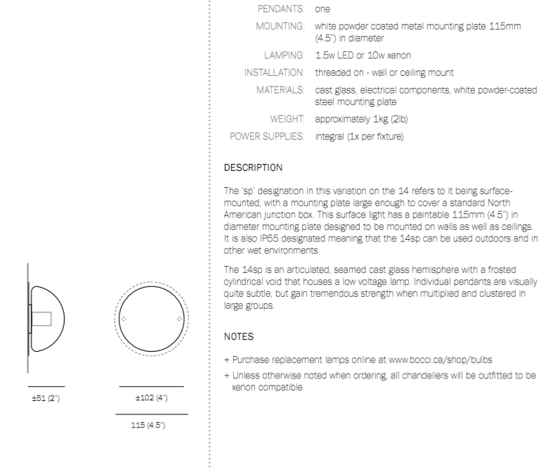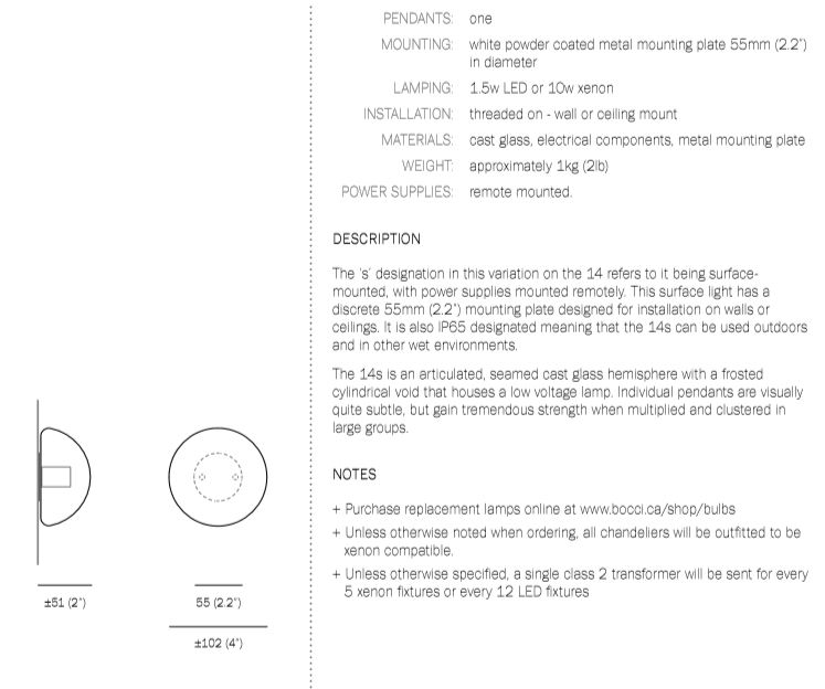 The 14s/sp is a low-voltage wall- or ceiling-mounted light made of a cast glass half sphere with a frosted cylindrical void that houses either a 10-watt xenon or 1.8-watt LED lamp. 14s / 14sp have an IP65 rating which means they can be used outdoors and in other wet locations.