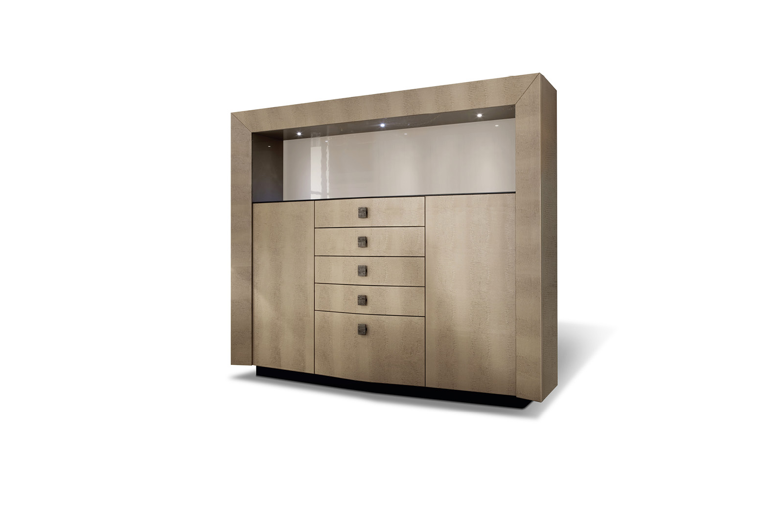 Double bookcase in armadillo printed leather with combination of bronzed brass top, base and handles. Back panel in high gloss polyester lacquer. 4 full extension drawers + 1 full extension file drawer with bottom in armadillo printed leather. Special led light sytem with 3 lights including touching switch.