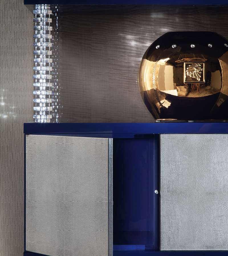 2 sections modular Bookcase in combination of tiger African sycomore veneer with high gloss polyester finish and 4 doors in silver lizard printed leather with inside in cobalt blue high gloss polyester finish. Florentine crystal inserted with led light touching system.