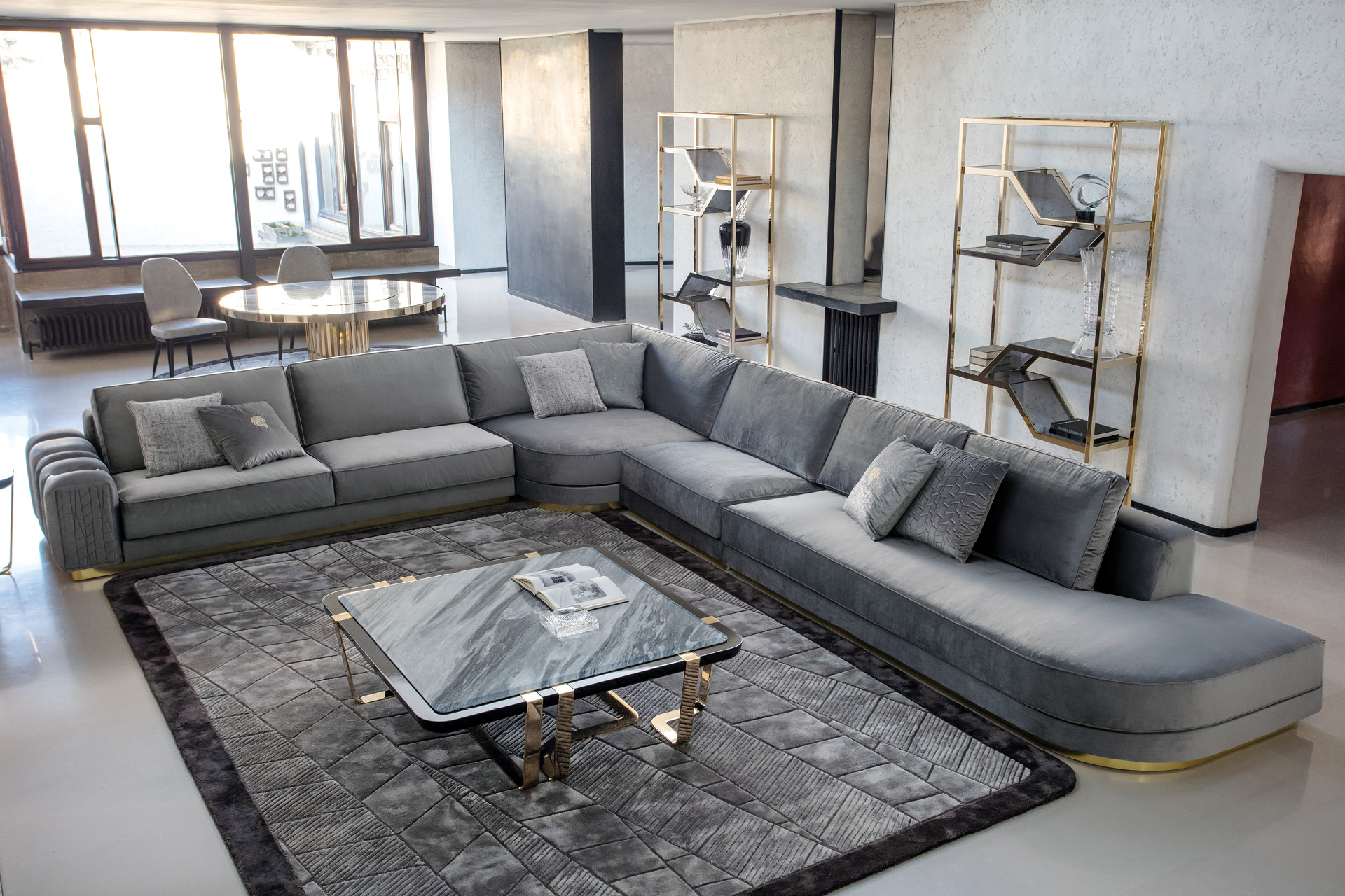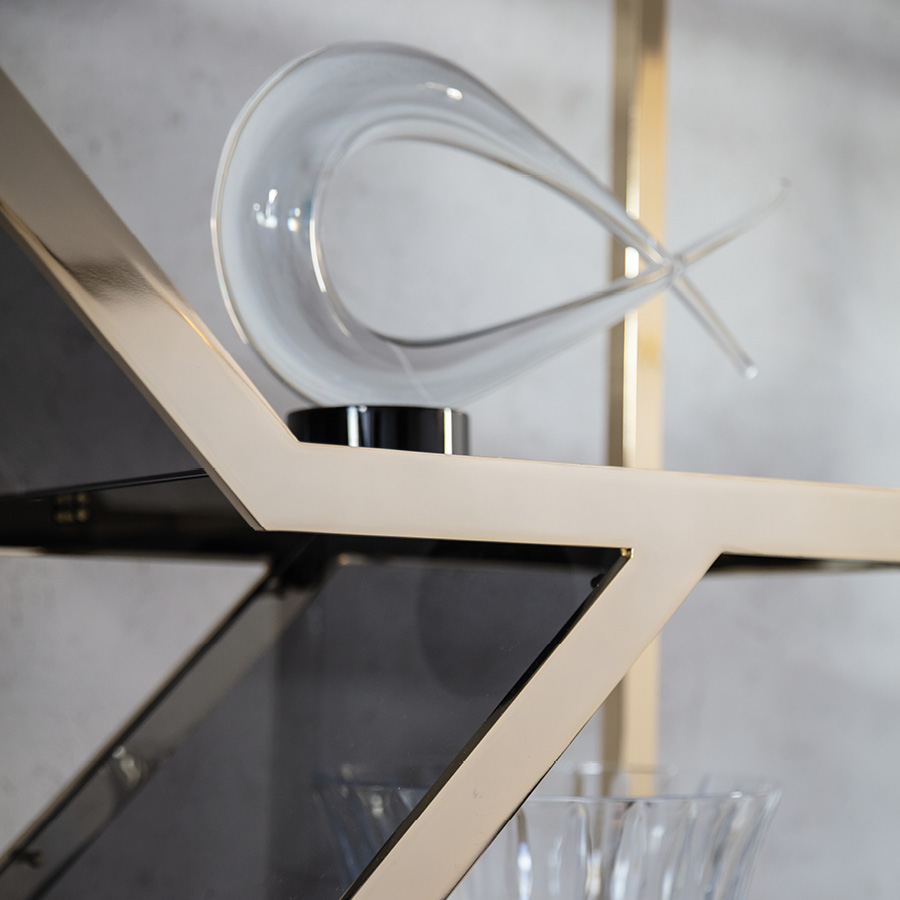 Bifacial showcase in light gold chrome stainless steel frame. 9 tempered fixed smoked glass shelves.