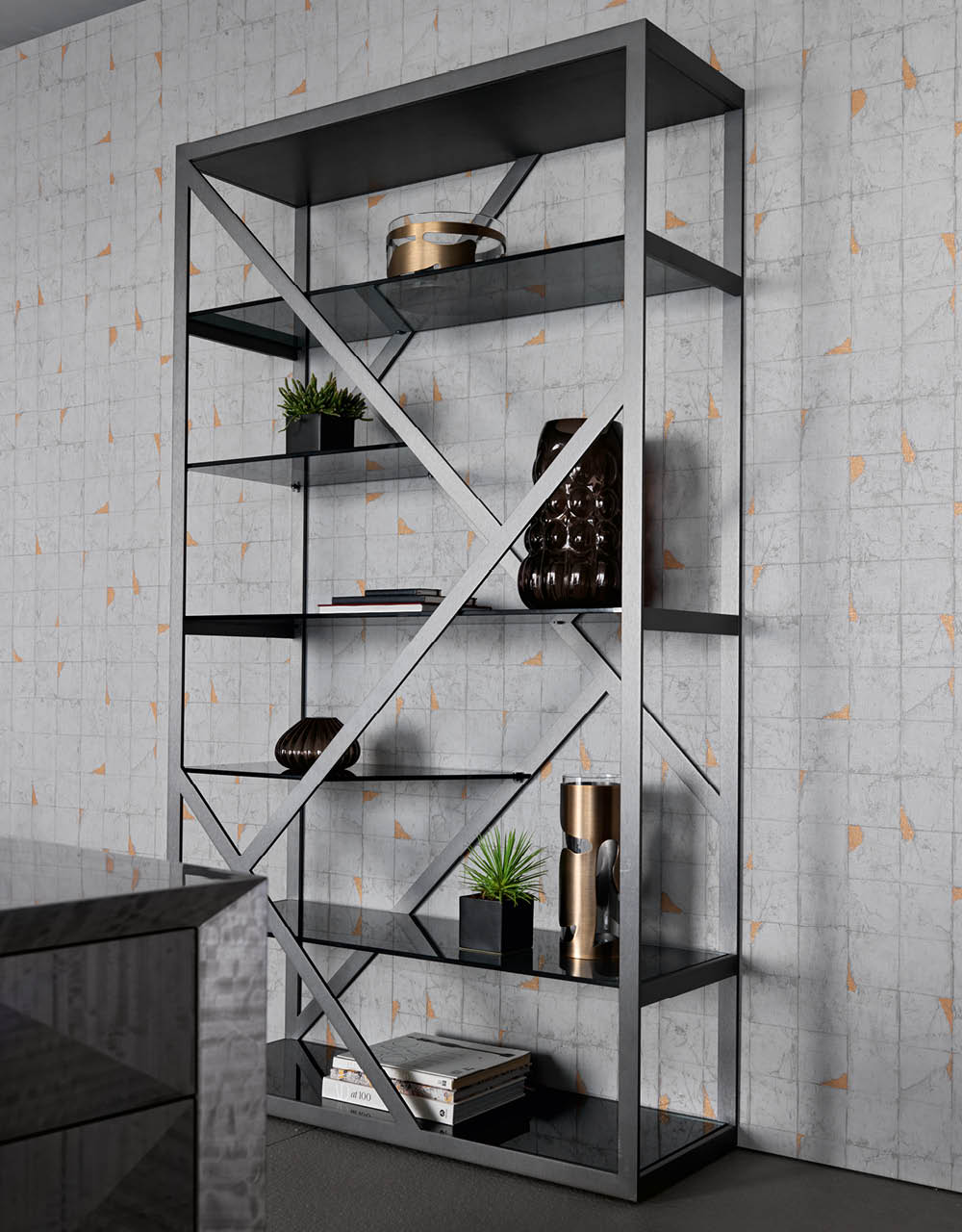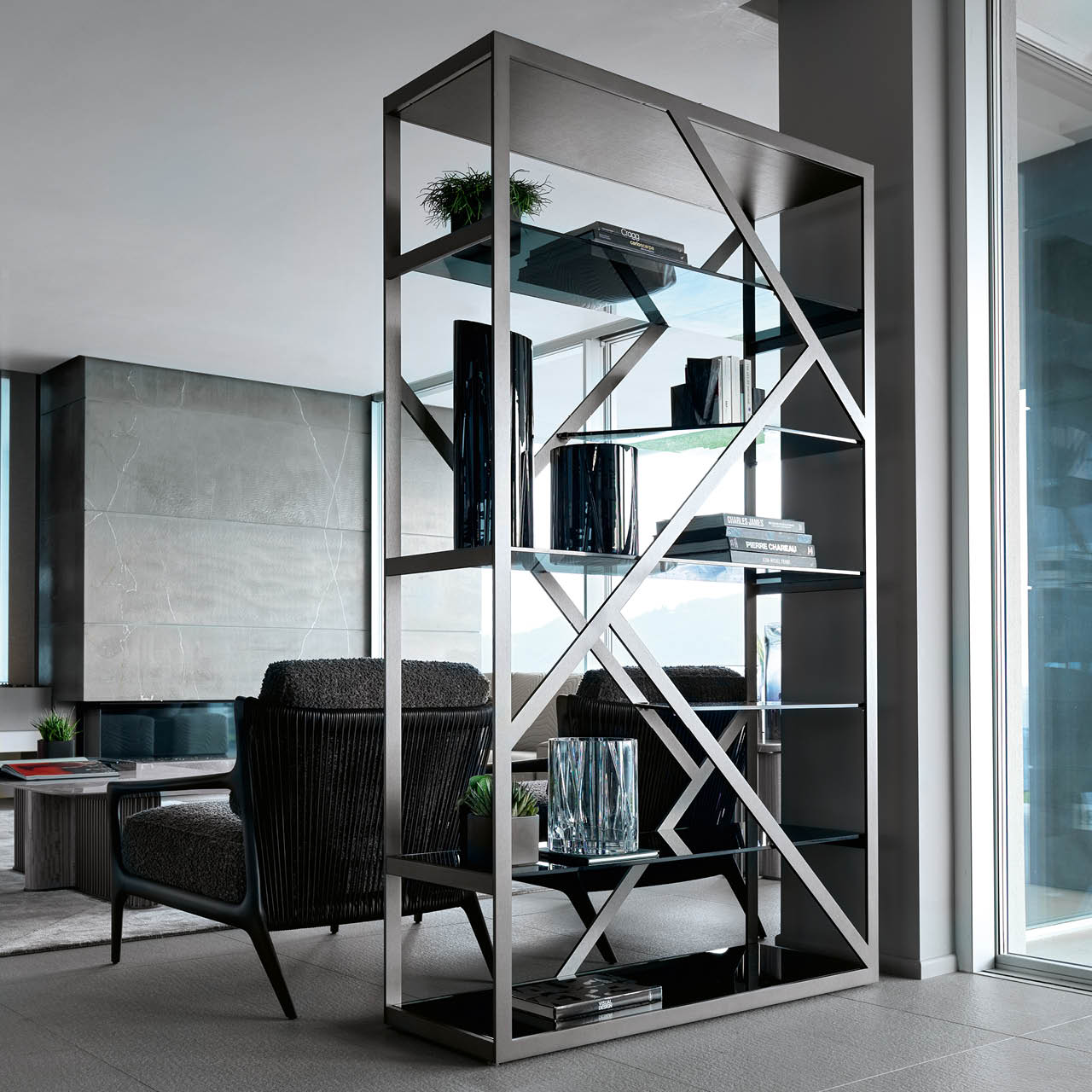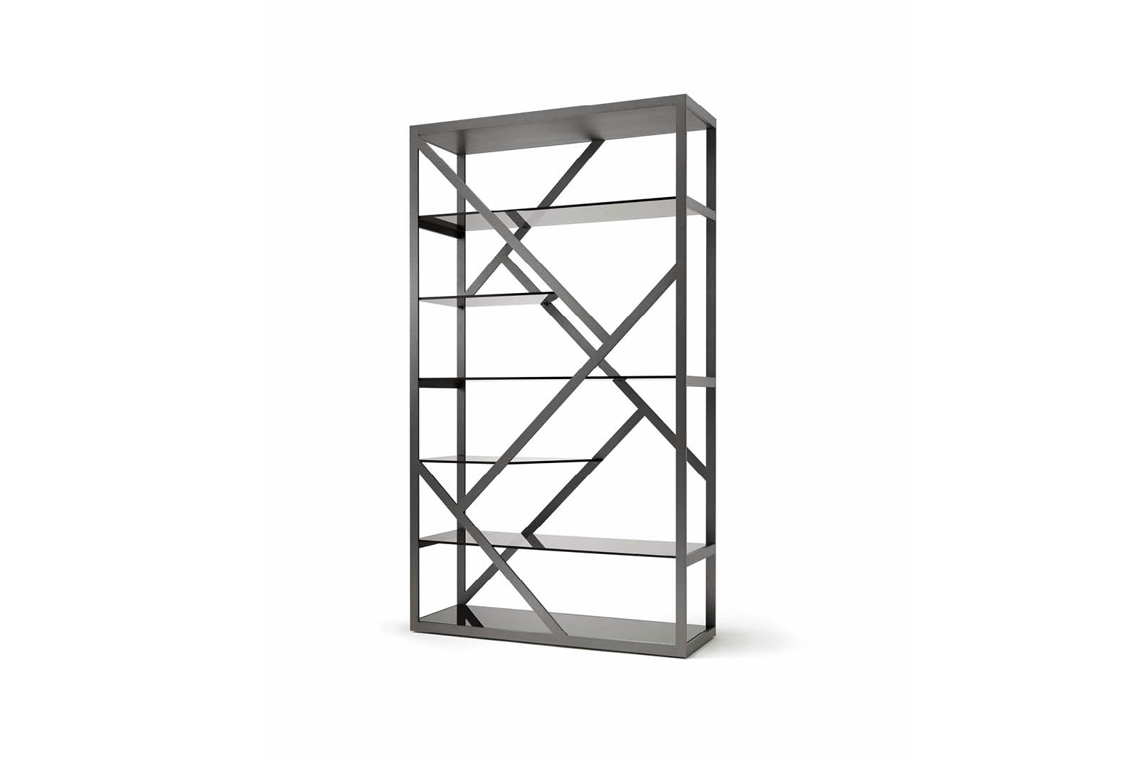 Bifacial showcase in satin grey nickel stainless steel. 5 tempered fixed smoked glass shelves.