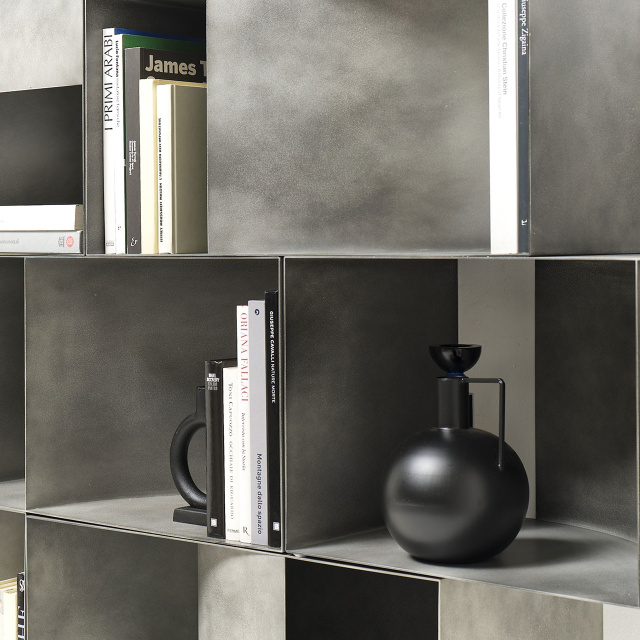 Contenitore in metallo funzionale e decorativo, organizza e segna lo spazio all'insegna della versatilità. Disponibile nella versione pensile e nella versione a terra. I moduli possono essere affiancati creando infinite composizioni adattandosi a qualsiasi spazio ed esigenza, nella versione da terra può essere utilizzato come elemento divisorio per separare grandi spazi. Curve concave e convesse si alternano e generano sequenze sempre diverse di pieni e di vuoti dando origine ad elementi dinamici e scultorei che arredano con libertà lo spazio domestico.