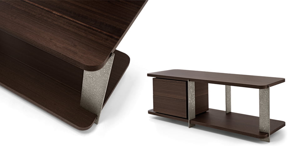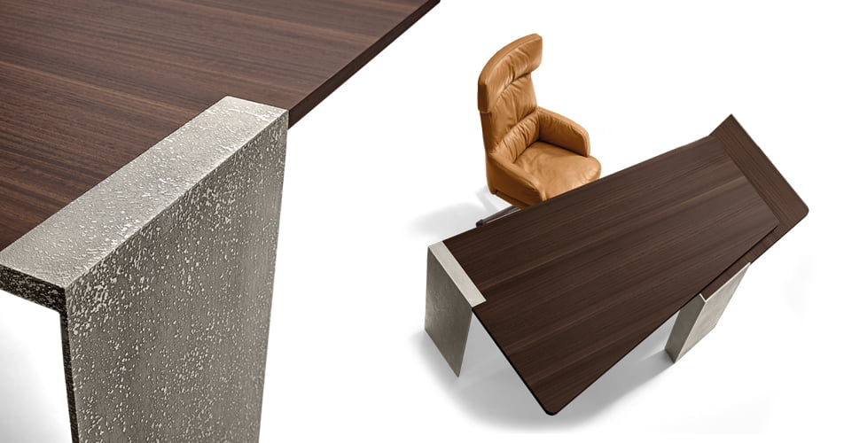 Scrivania executive e consòlle: top e pannelli laterali in una nuova essenza di eucalipto, gambe e piedi in metallo texturizzato Magnesio in tonalità grigio-argenteo.