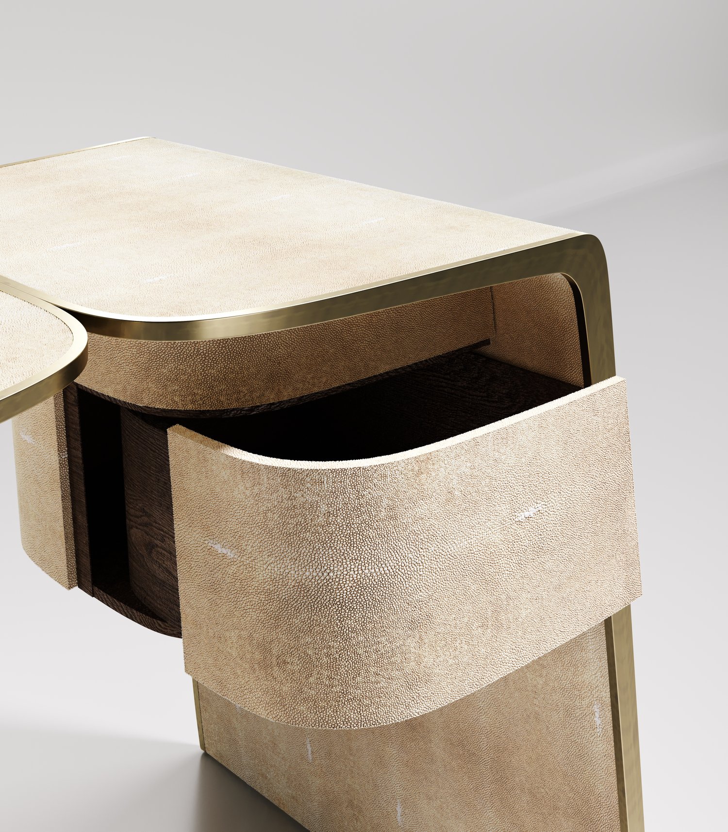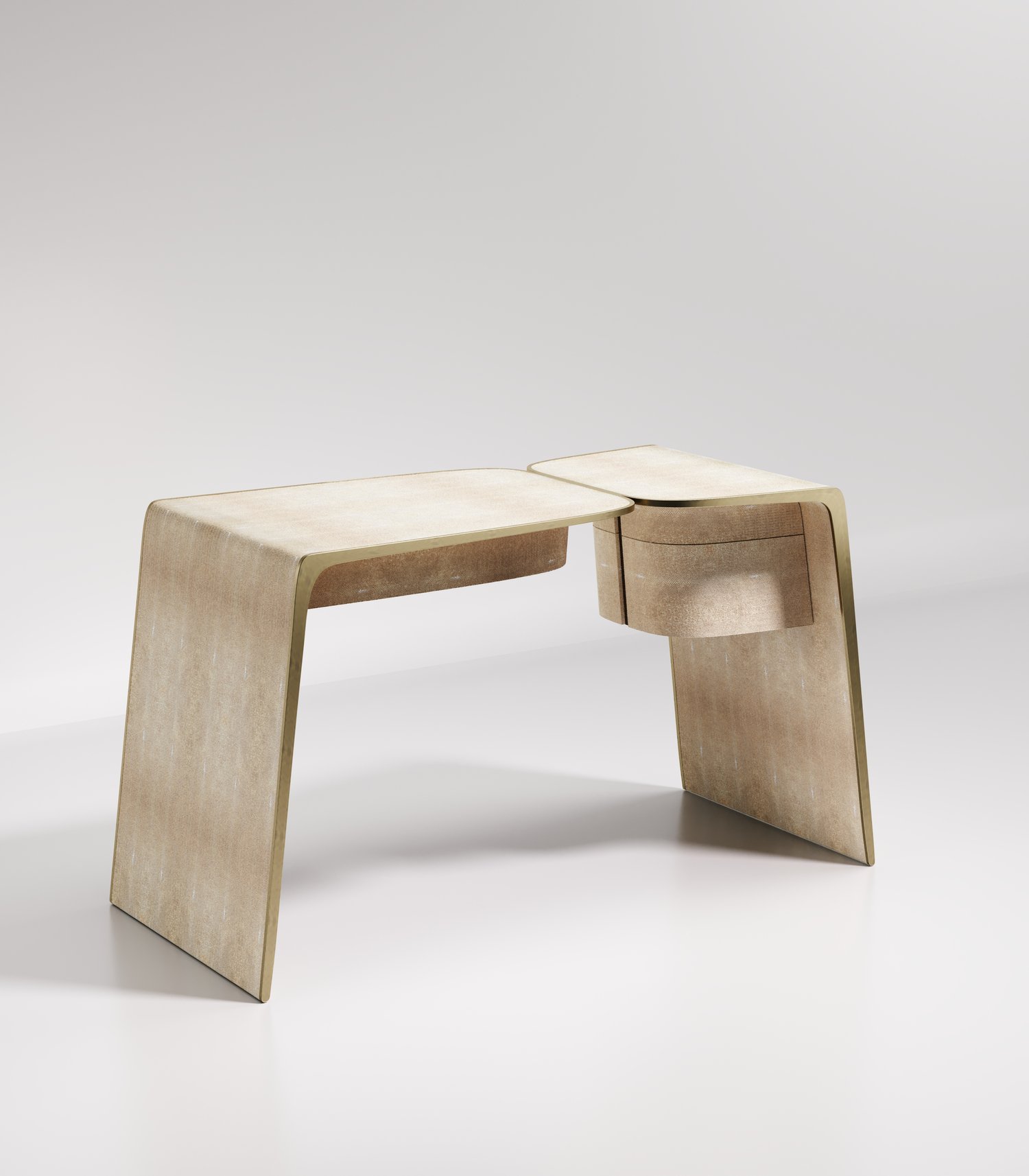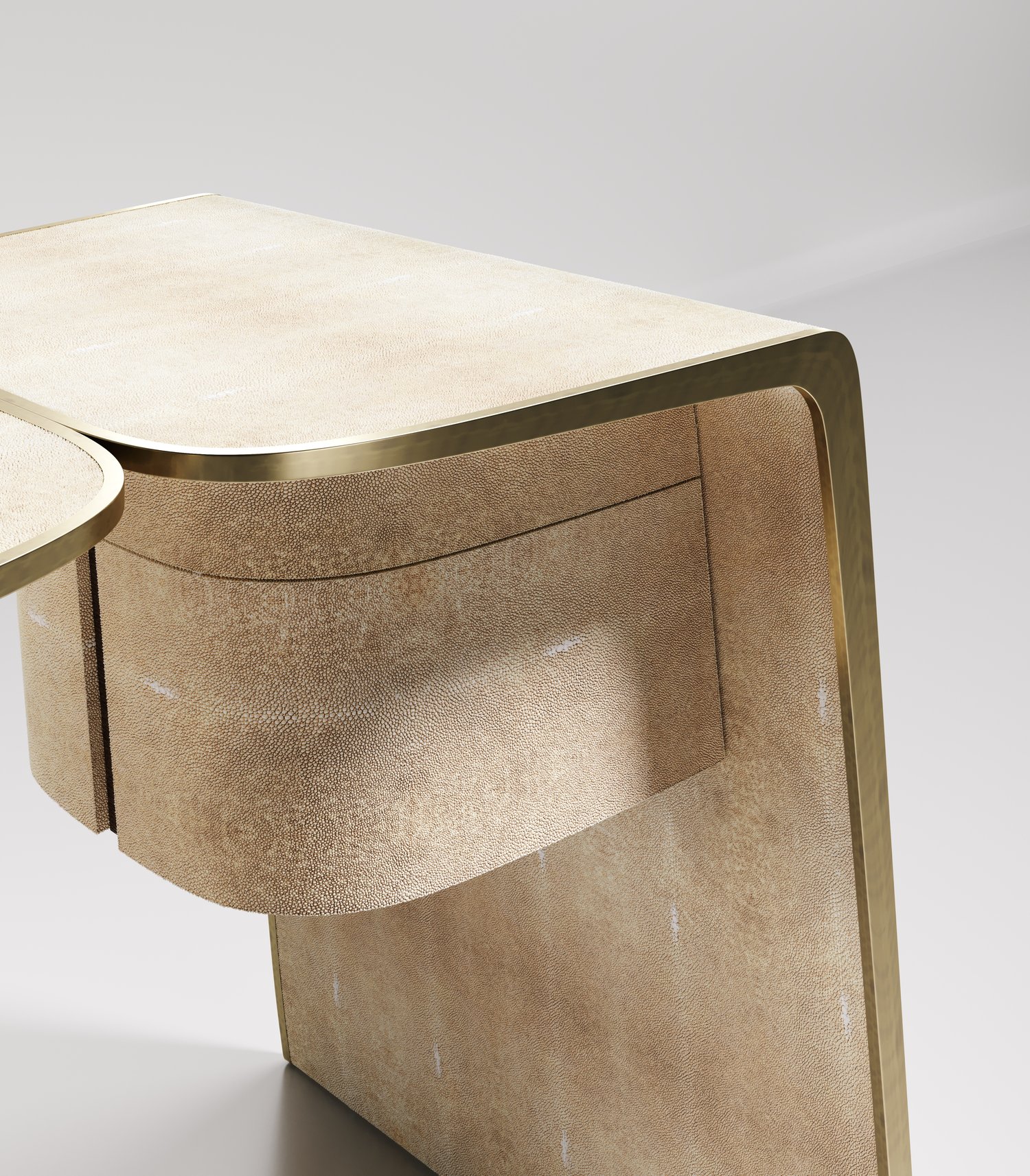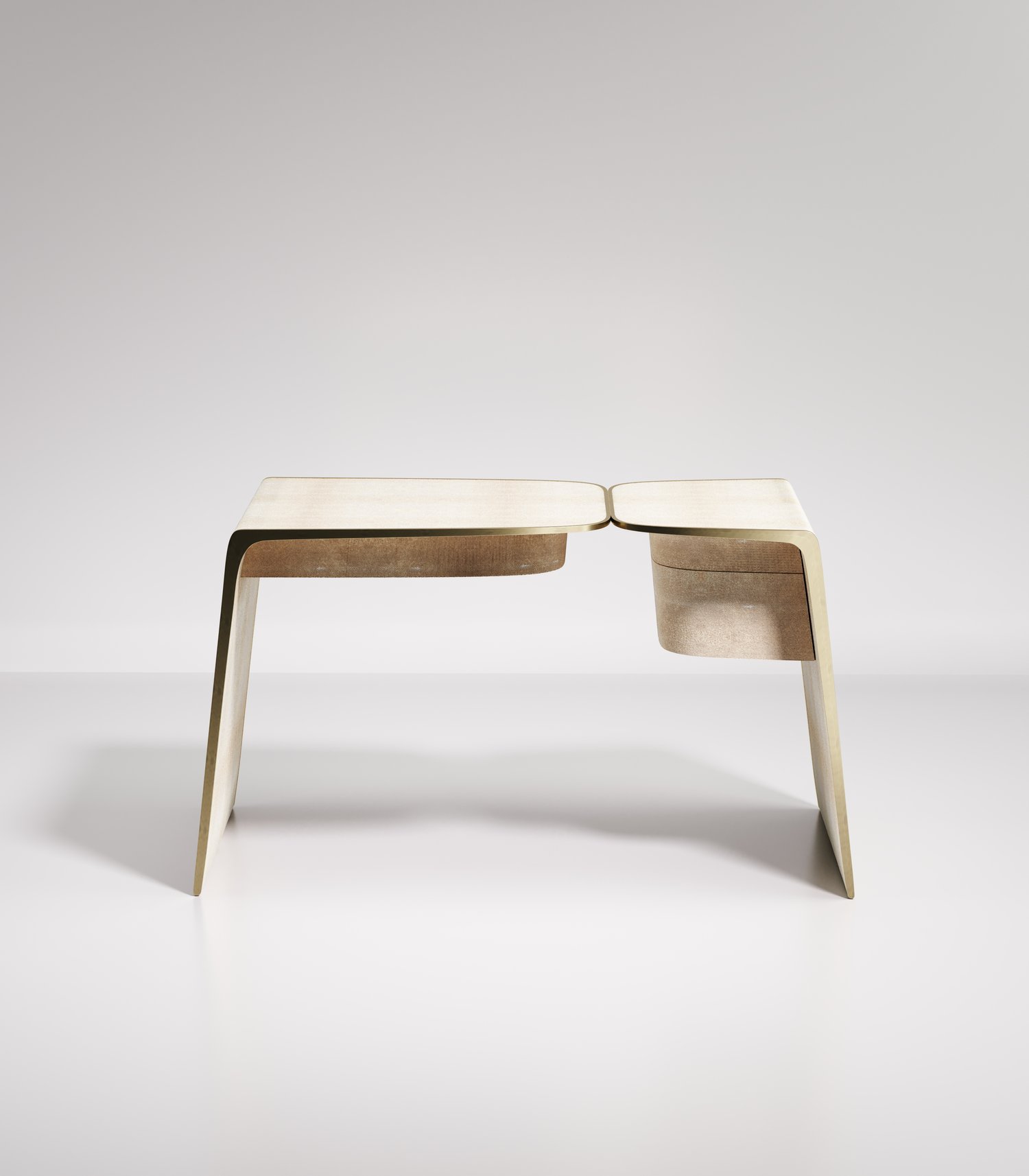 The kiss writing desk by Kifu Paris is an elegant and organic piece in it's unique design. The cream shagreen inlaid piece curves inwards to create the "kiss" effect. The borders are accentuated by bronze-patina brass. This piece includes 3 drawers total. This piece is designed by Kifu Augousti the daughter of Ria and Yiouri Augousti. Available in other finishes. Part of the Kiss Capsule.