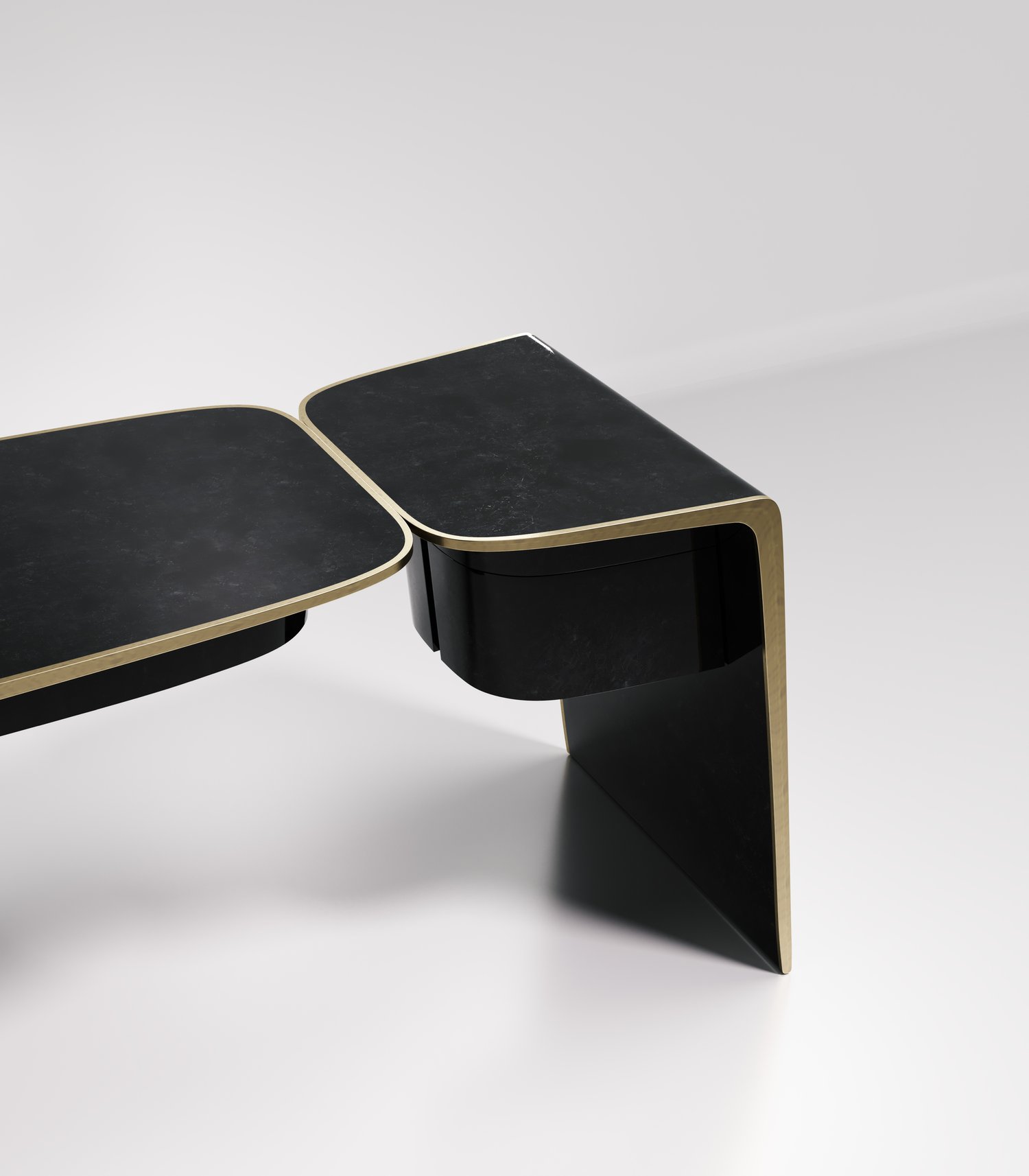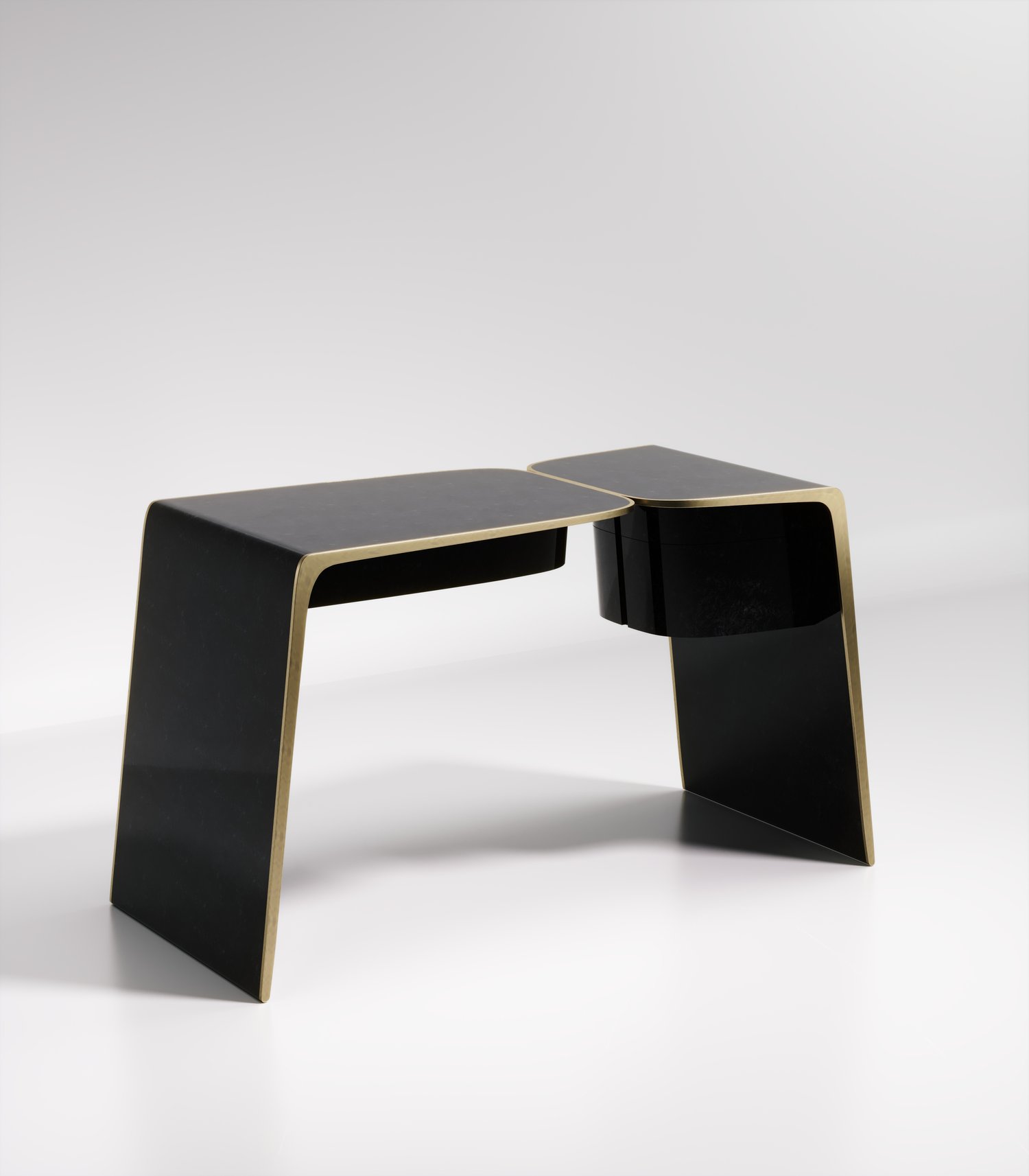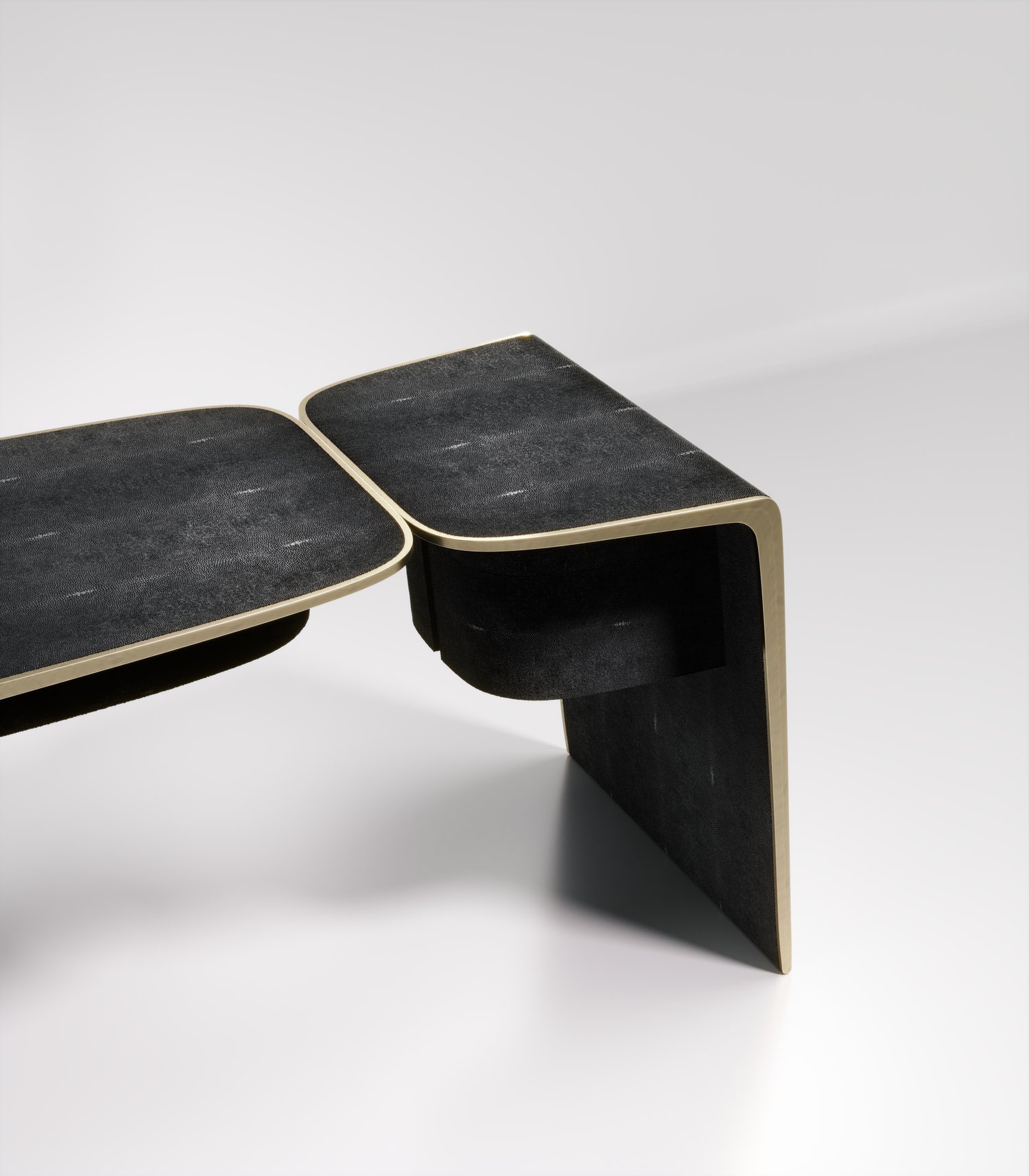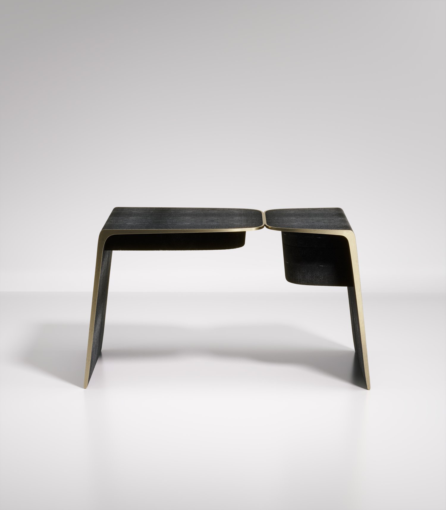The kiss writing desk by Kifu Paris is an elegant and organic piece in it's unique design. The cream shagreen inlaid piece curves inwards to create the "kiss" effect. The borders are accentuated by bronze-patina brass. This piece includes 3 drawers total. This piece is designed by Kifu Augousti the daughter of Ria and Yiouri Augousti. Available in other finishes. Part of the Kiss Capsule.