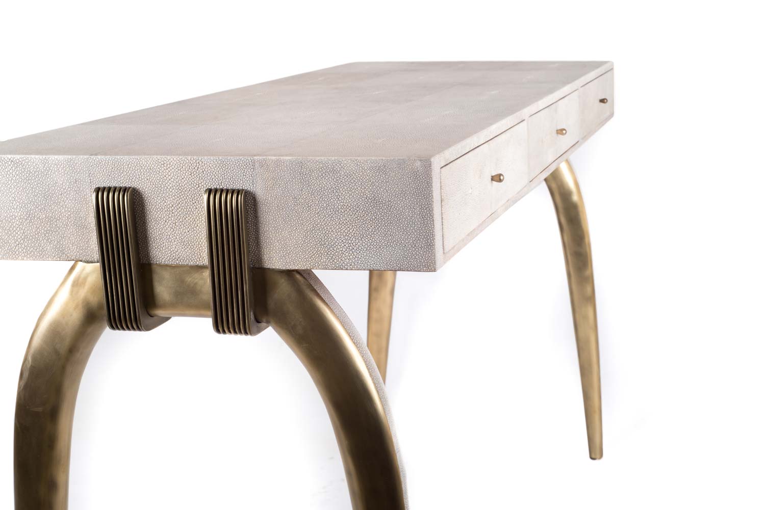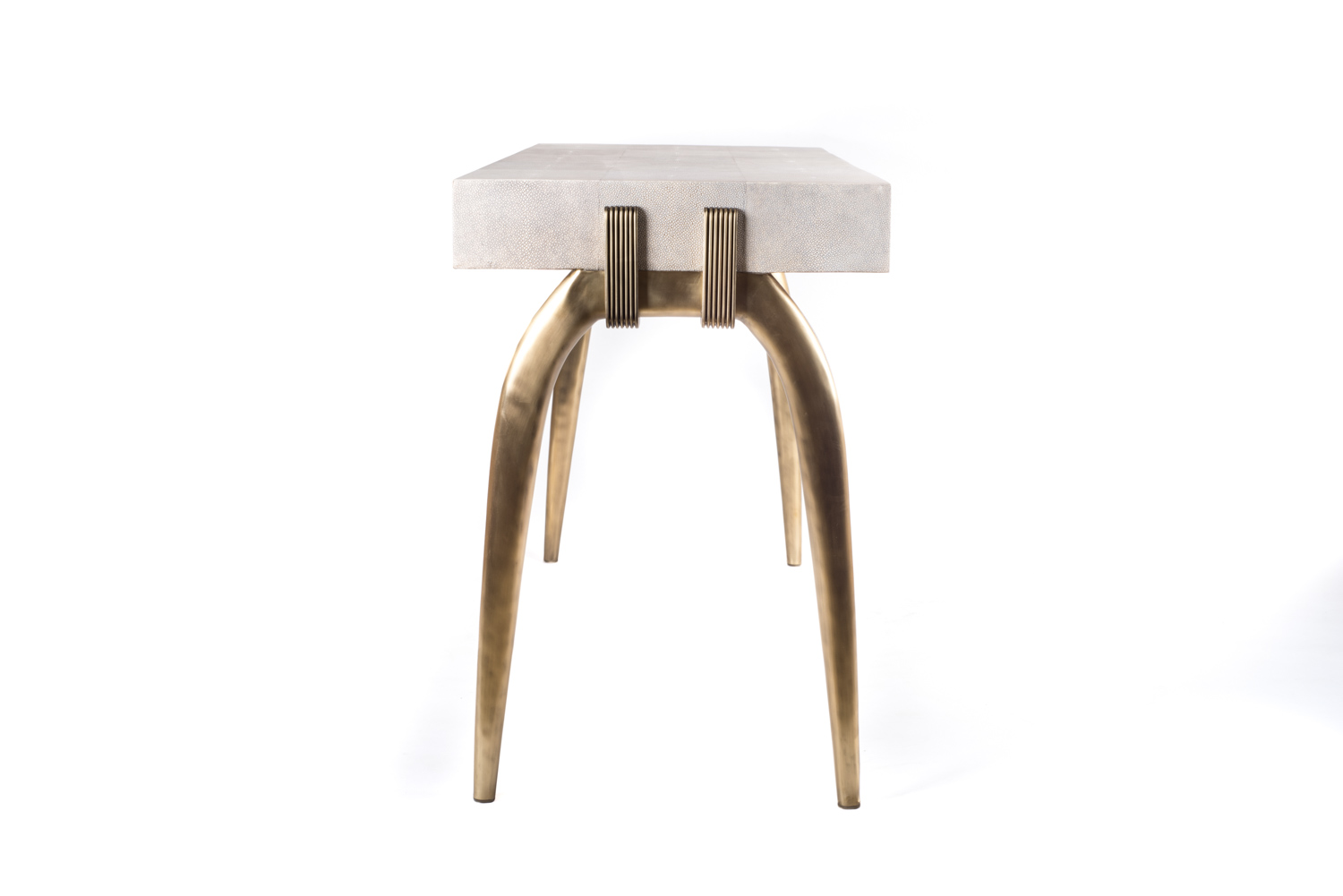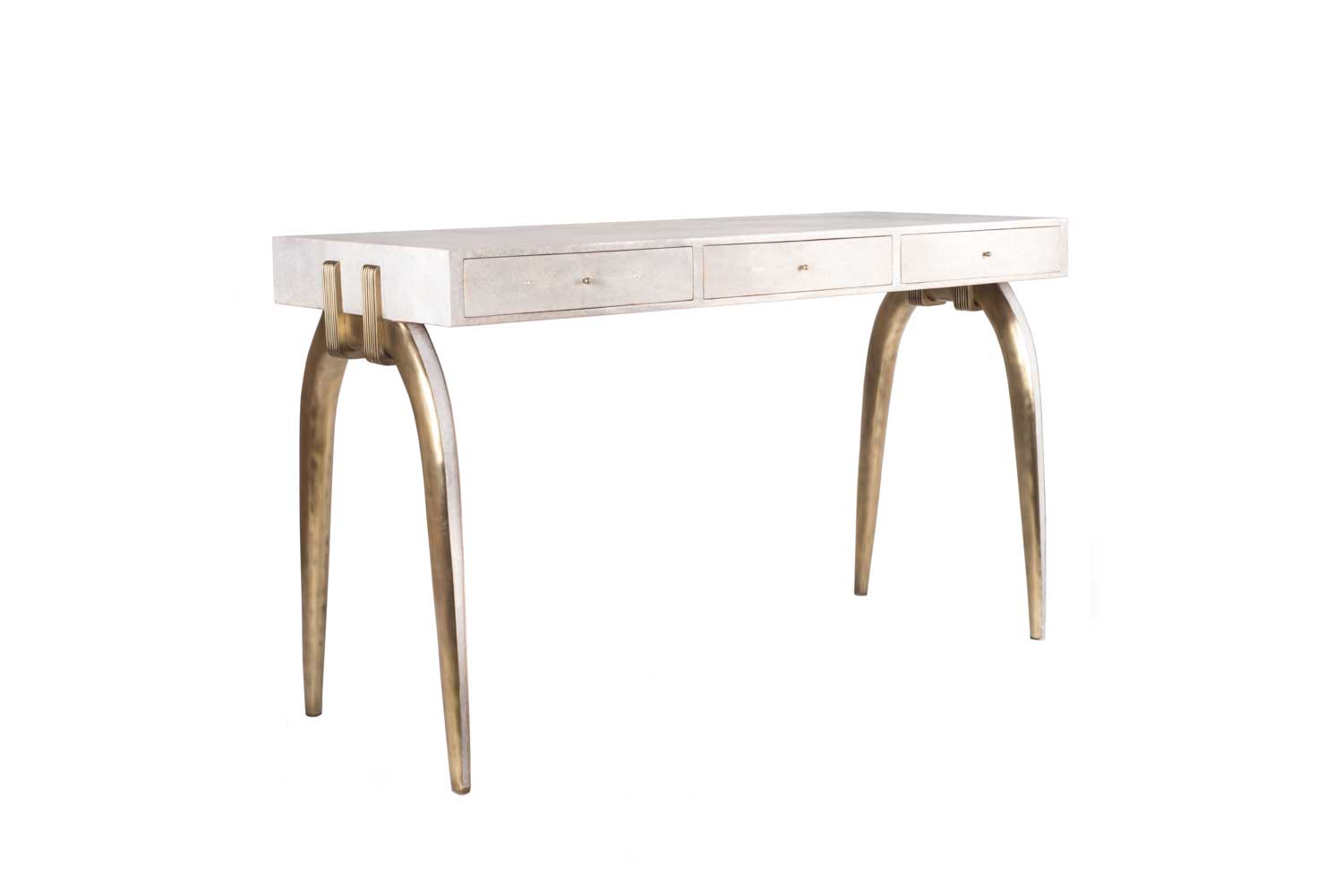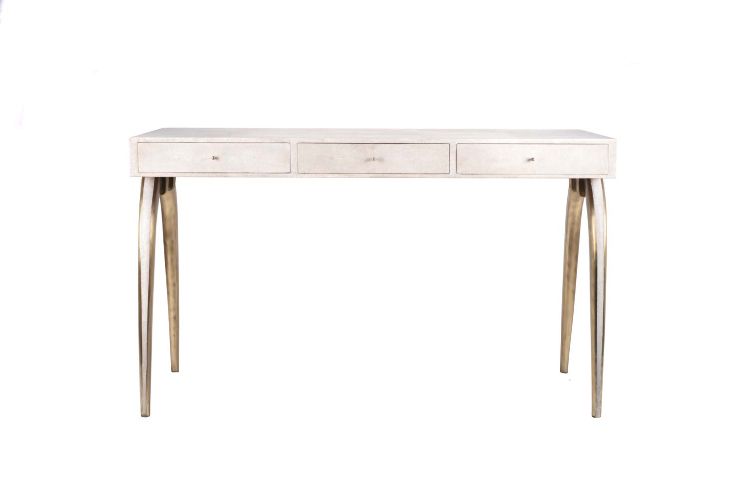 The Sonia writing desk is the perfect piece for your room. A more subtle version to her sister the iconic writing desk, the Sonia has elegant legs inlaid in shagreen and bronze-patina brass. Add a mirror and this desk becomes a vanity table. This desk has three drawers. The finish of the shagreen is authentic as it is hand-dyed and the designer calls the finish look: "antique natural shagreen."