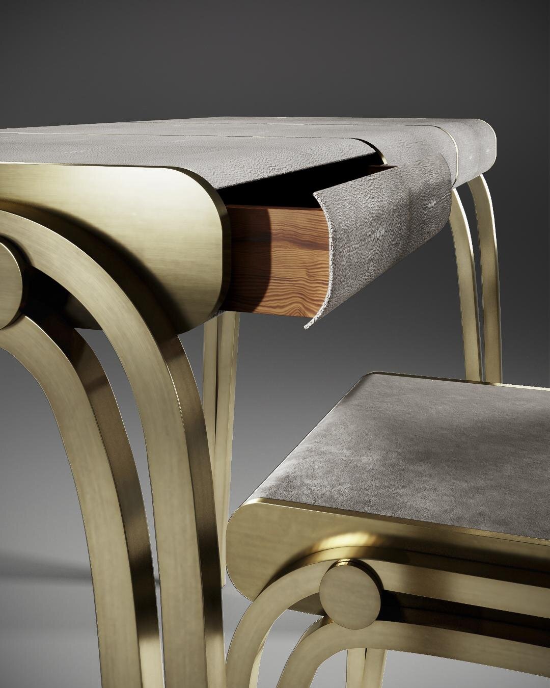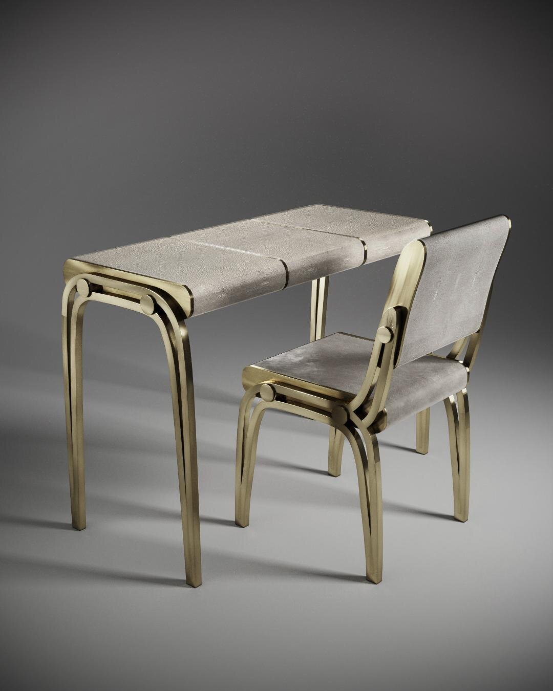 The Victoria Desk inlaid in cream shagreen by R&Y Augousti is a sophisticated piece that is minimal, with intricate brass details creating an elegant and luxurious aesthetic. The three rounded drawers make it ergonomic to open a close. Add a mirror and this piece becomes a vanity.