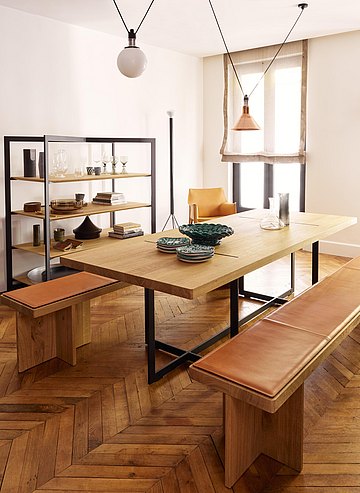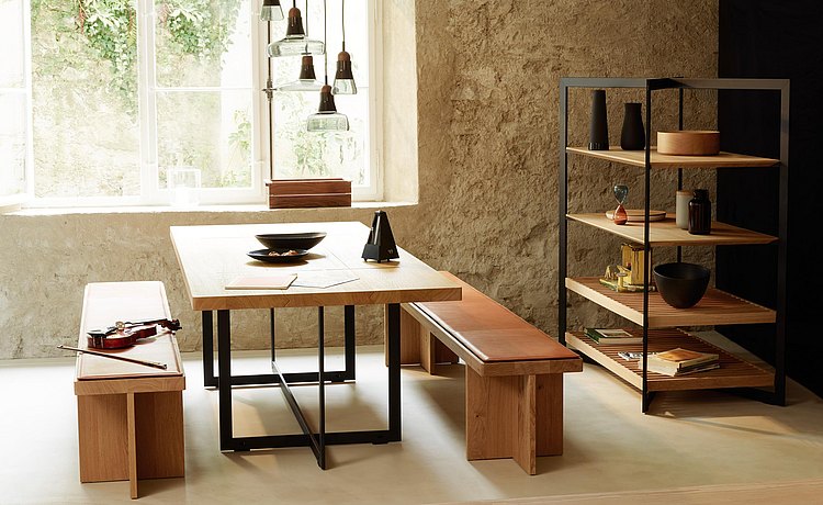 In most cases, we forget what we ate, but not with whom we spent this precious time: Talking, laughing, and having a good time together. Unique grains and particular growth characteristics make each b Solitaire table a unique piece. Together with the solid oak bench and matching cushion in natural tanned leather, it offers the perfect invitation to linger.