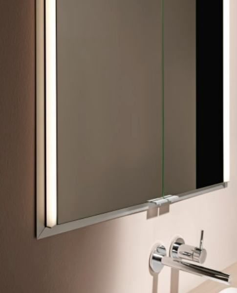 Mirror cabinet, 450 mm, aluminium, 1 door mirrored on both sides, left hinged, with sensor switch, 2 sockets, 2 vertical LED lighting elements (dimmable)