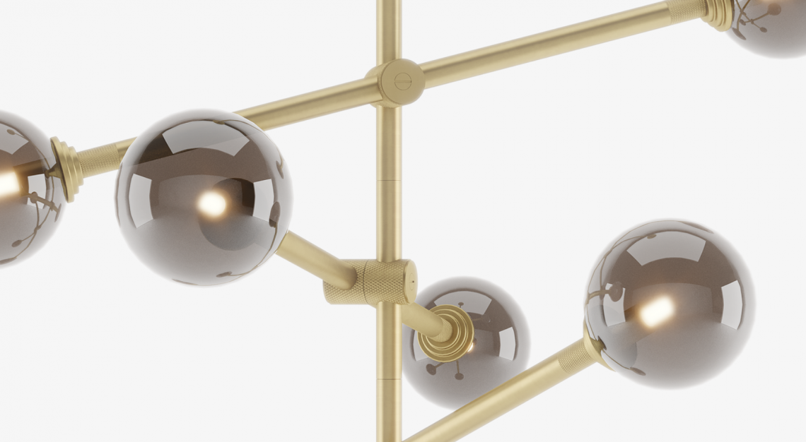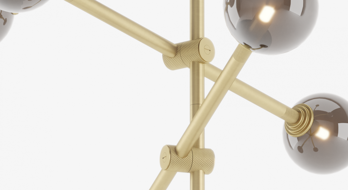 Perfect for high ceilings, the SAPA ceiling lamp features a set of articulated arms that allow for various configurations, while the considered combination of smoked glass and brass makes for a unique lighting style.