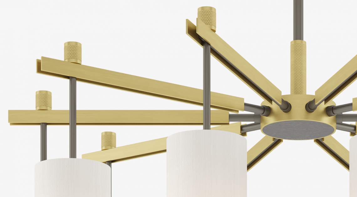 A blend of brushed, knurled and oxidised brass, the chic ZURICH ceiling lamp showcases one material in several ways. Its central stem emanates outwards into ten arms, each of which suspends a cylindrical double silk shade,