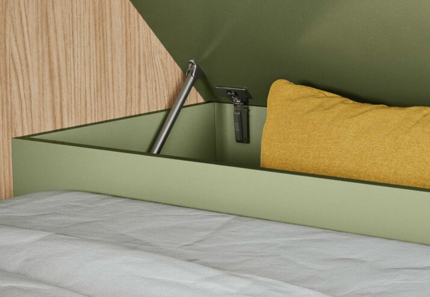 Con i suoi fianchi sagomati più larghi alla base, il ponte Tippy accoglie un letto, uno scrittoio o entrambi. E grazie al meccanismo, lo scrittoio lascia spazio al secondo letto senza dover spostare nulla.