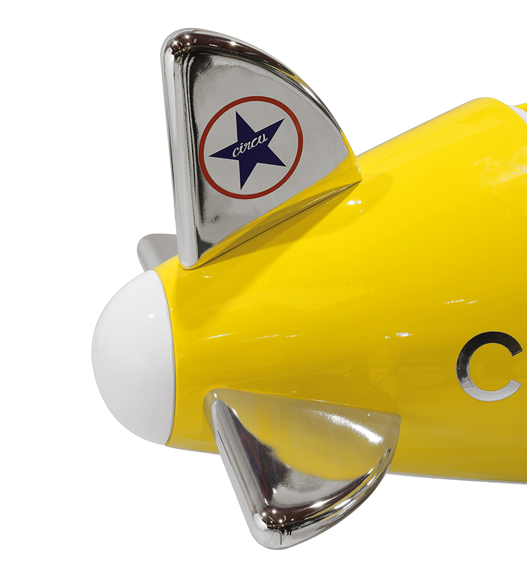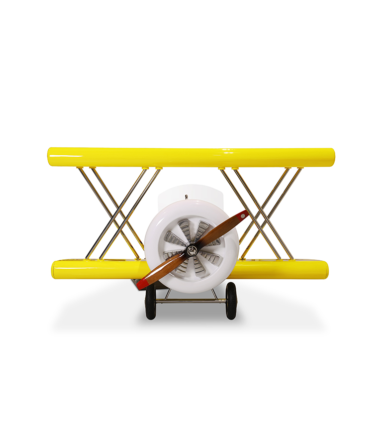 The body is entirely made of fiberglass with glossy varnish applied and chrome plated finishes in the engine and wheels. The Sky B Plane has several storage compartments and the top wing is designed to be used as a bookshelf.