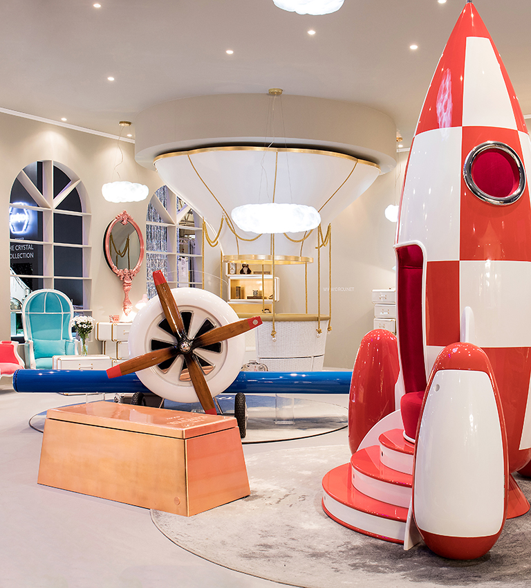 This exclusive toy box is built on wood, lacquered with metallic paint and has copper leaf finishes. It features a rotating cover and a secret compartment, for the most treasured kids’ goods.