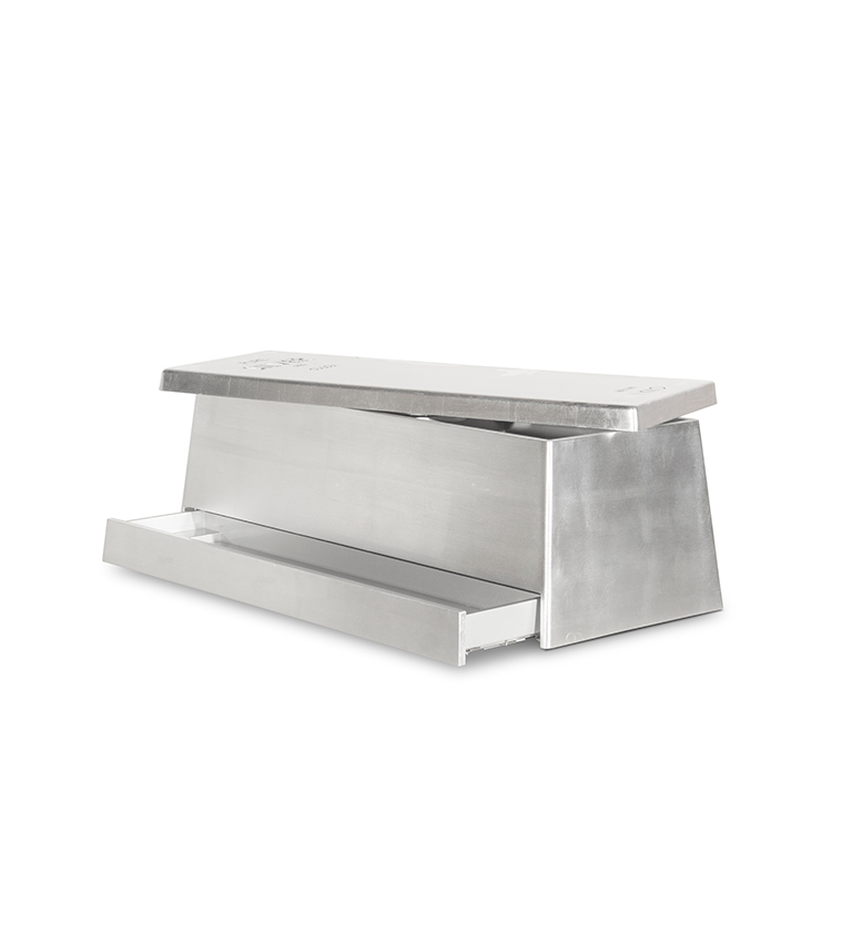 Silver Box is a luxurious kids’ toy box inspired by the fine silver bar shape. Inspired by the adventures of Scrooge McDuck, the richest duck in the world, this toy box is a useful storage solution for kids’ precious toys and secret treats.This exclusive toy box is built on wood, lacquered with metallic paint and has silver leaf finishes. It features a rotating cover and a secret compartment, for the most treasured kids’ goods.