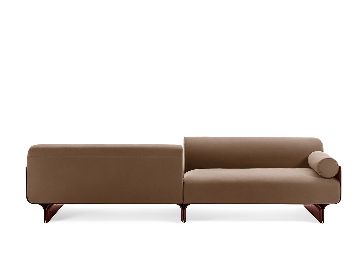 Divano con base in frassino curvato tinto nero poro aperto e dettagli in ottone lucido. Disponibile anche versione laccata opaca nei colori: “Rosso Persia”, “Grigio Londra”, “Nero Giza”, "Bianco Camargue", "Verde Provenza", "Blu Pacifico", "Bordeaux Etruria", "Rosa Jaipur" e "Sabbia del Nilo". Imbottito in poliuretano espanso e piuma d'oca. Rivestito in tessuto o pelle nei colori del campionario. Fornito di due braccioli terminali cilindrici in piuma rivestiti nello stesso tessuto/pelle del divano. Rivestimento sfoderabile, non disponibile per le seguenti categorie: Cat. L1, L2 e pelle cliente/C.O.L. Per la realizzazione di elementi con rivestimento in pelle sono necessarie cuciture aggiuntive rispetto gli elementi con rivestimento in tessuto.