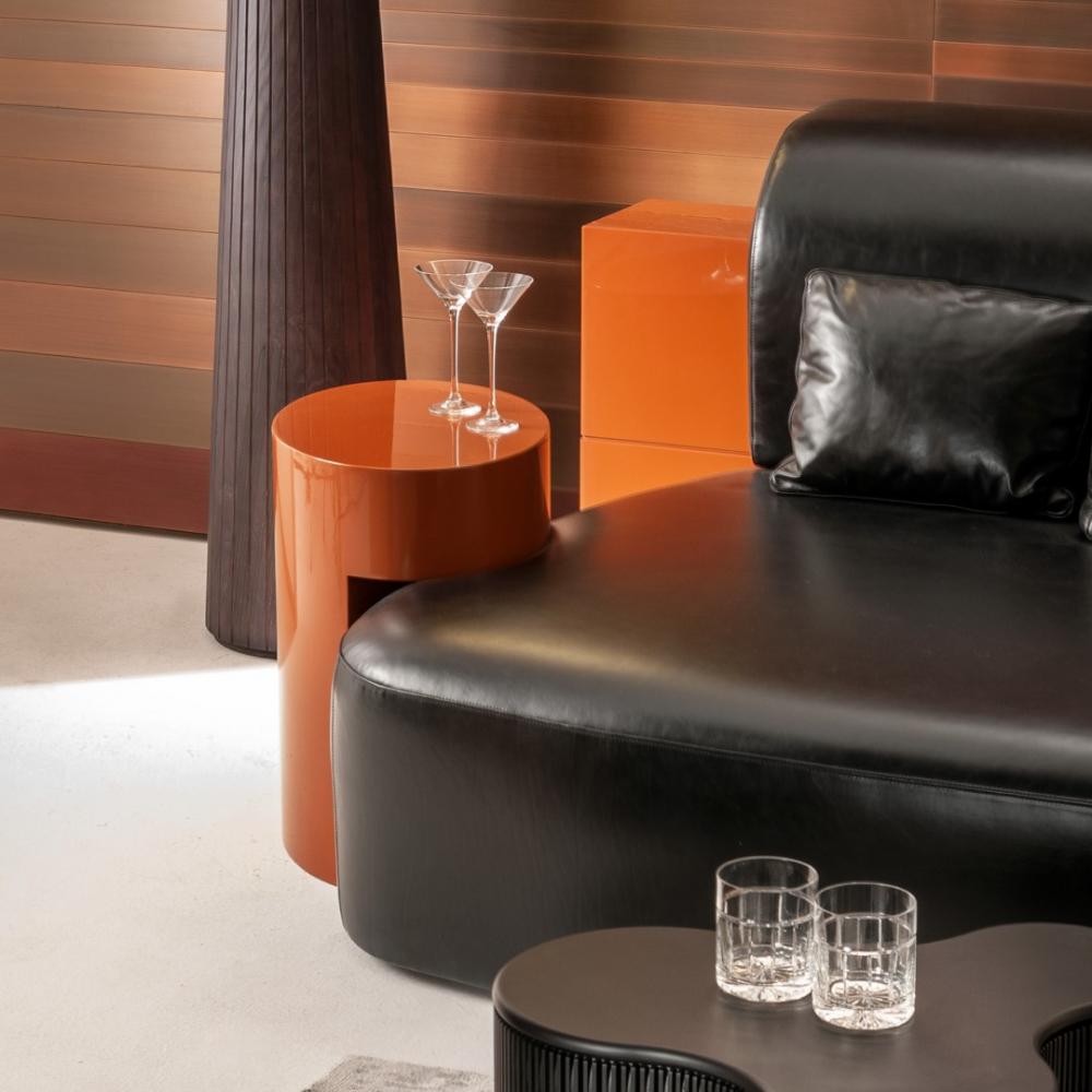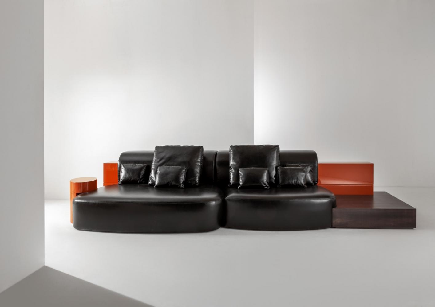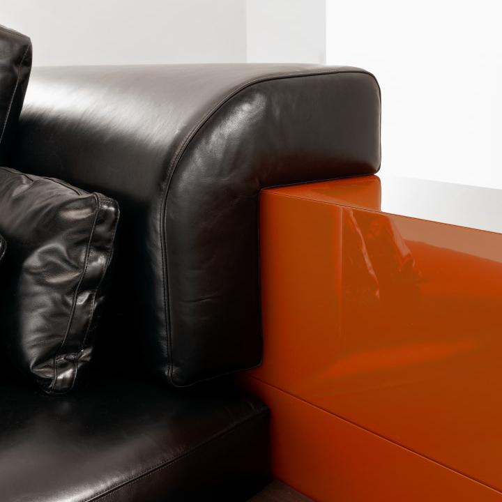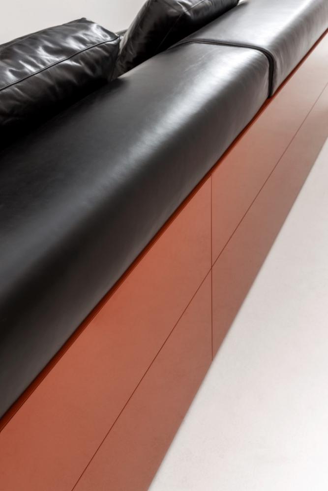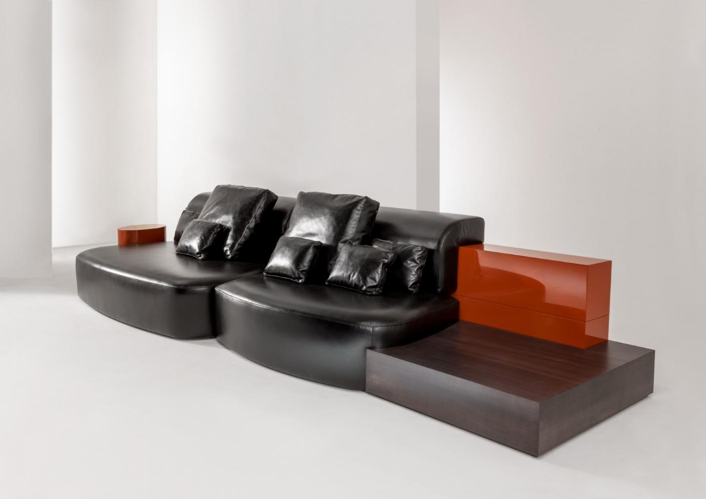 The backrest and integrated elements are available in plain, dyed, matt or glossy lacquered wood, and in various finishes from the Laurameroni collection. Decorative cushions are available.