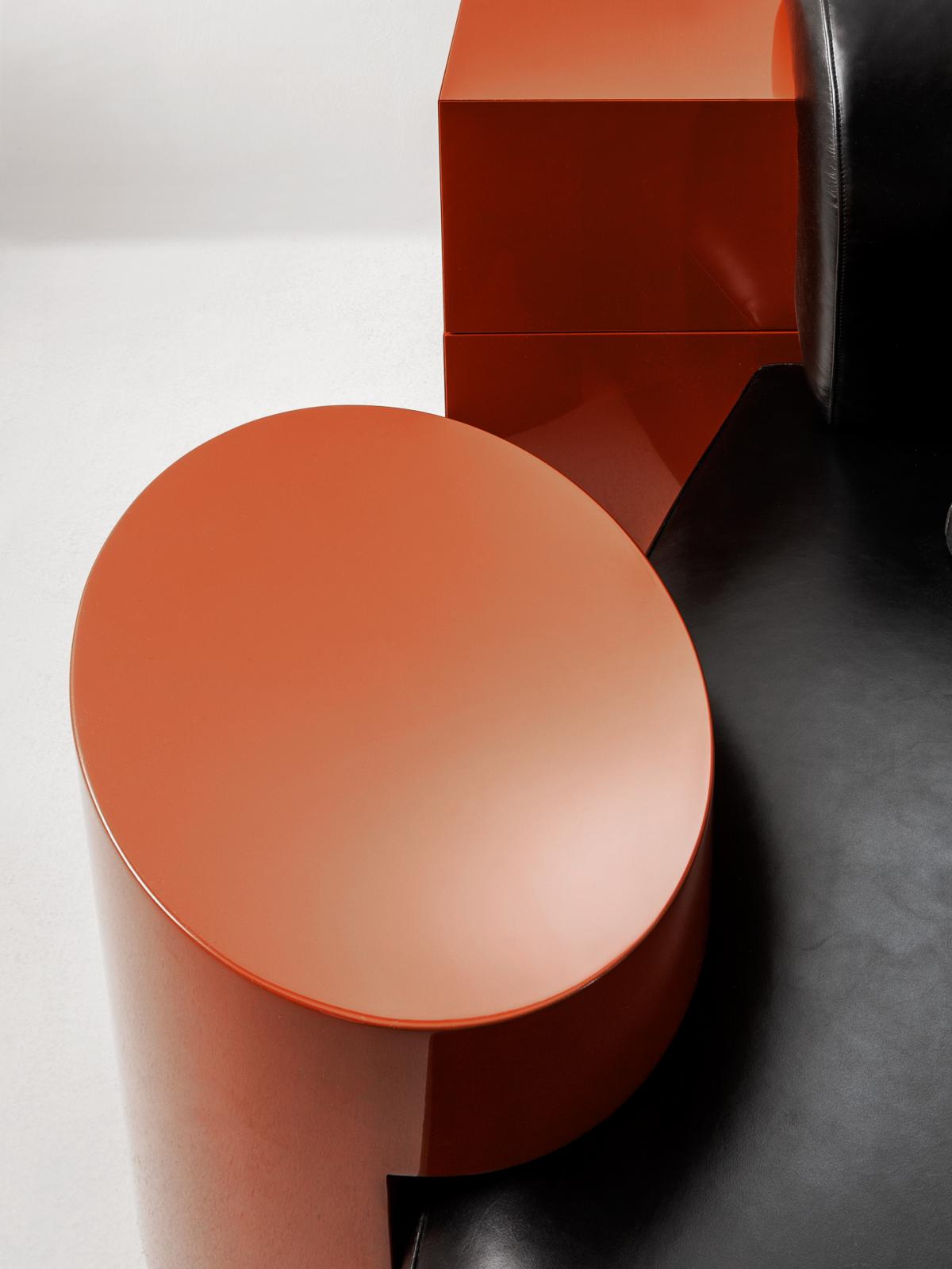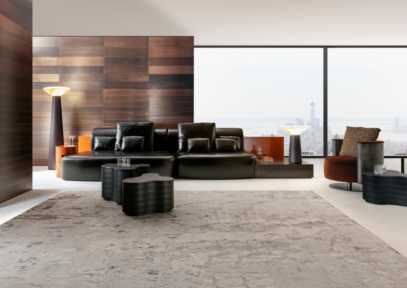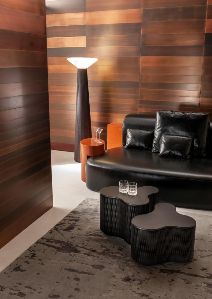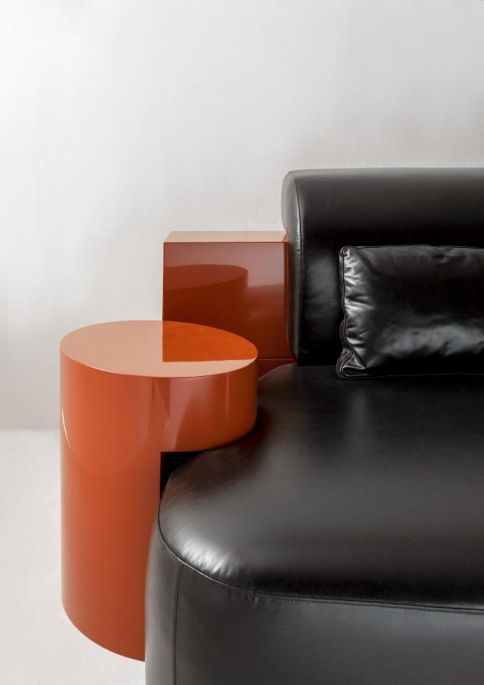 The backrest and integrated elements are available in plain, dyed, matt or glossy lacquered wood, and in various finishes from the Laurameroni collection. Decorative cushions are available.
