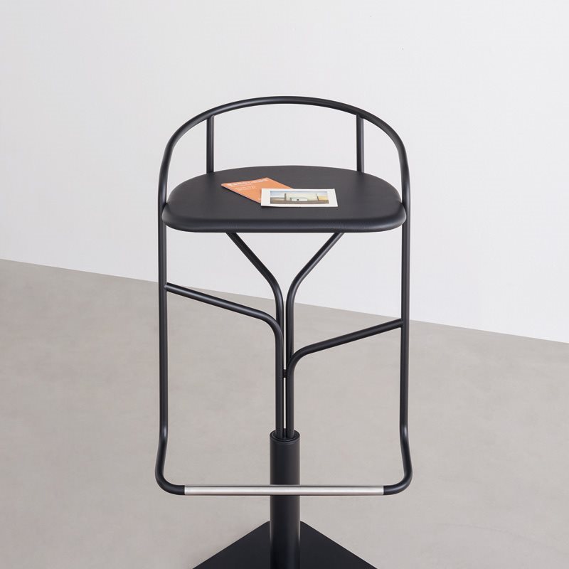 It’s the oriental inspiration from the art of ikebana that we find in Victor Vasilev's Ike stool with its striking contrast of nature's luxuriance and the simple, severe forms in which it is contained. The base is a steel plate topped by a simple support from which round tubes emerge like climbing plants to hold the seat. Stacking chair of tubular steel. Seat and backrest in polyurethane.The IKE collection, exception made for the swivel stool, is also available for outdoor. Fix or swivel stool with steel base and tubular steel frame. Available in two different heights, with polyurethane seat.