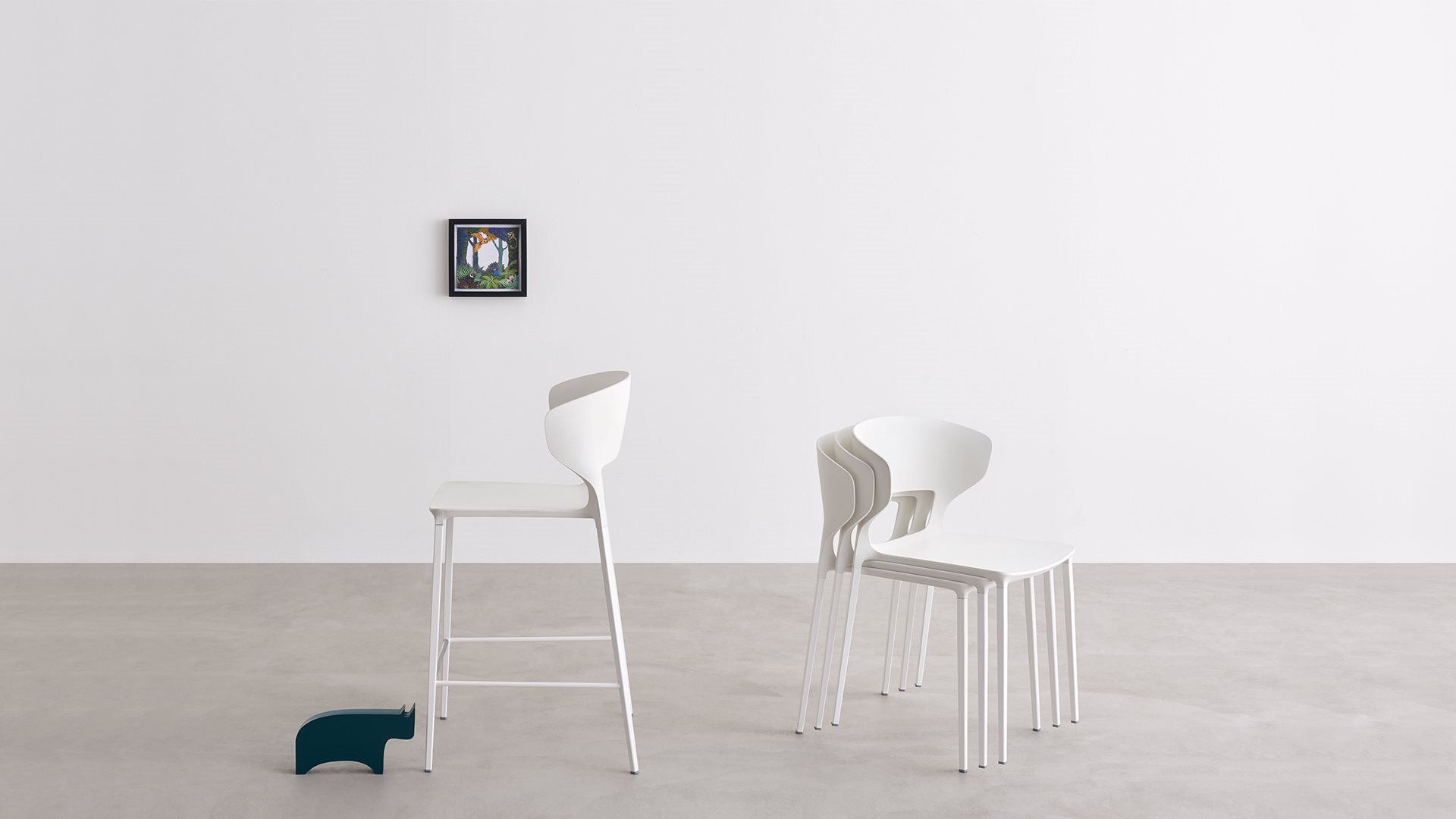 The contract world enters the domestic space with the Koki range of chairs and stools with a contemporary, fresh design. A perfect balance of form, function and innovation, fascinating from any prespective. Following on from the chair of the same name, the Koki stool adds a new element to the range's versatile character.Stacking chair with self-standing body in integral polyurethane, containing a steel frame. Mould-coating available in the different embossed colours as per sample collection. Steel legs in tubular conic shape, square section, lacquered in the same colours as the frame. Also suitable for outdoor.
