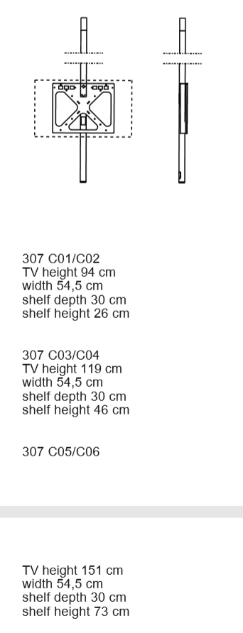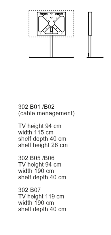 Tv-stand system for flat and curved screens. Swivelling steel frame. Integrated wiring box. Available in four versions: with base equipped of built-in monodirectional castors, with rear cable management, with rear wall- xing system and with swivelling floor-ceiling upright.