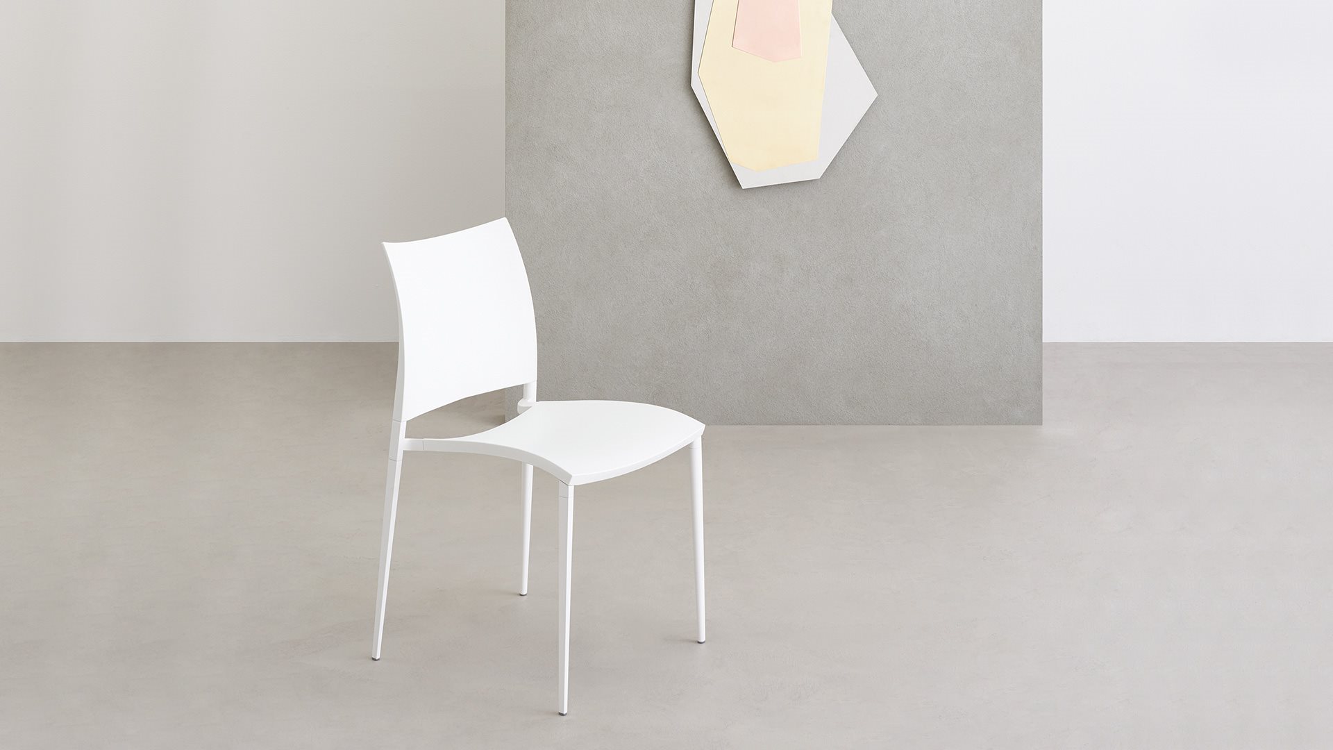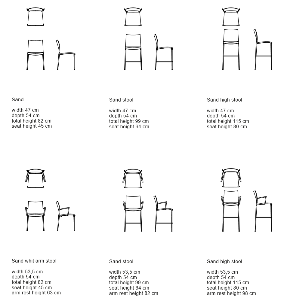 Stacking chair with or without armrests, die-cast aluminium frame. Seat and back of polypropylene, reinforced with ber glass, stabilised anti-UV. Lacquered frame versions with polypropylene suitable also for outdoor use. Available also with fabric, leather, eco-leather and cow-hide covering. The stool (not stackable) has the same characteristics as the chair.