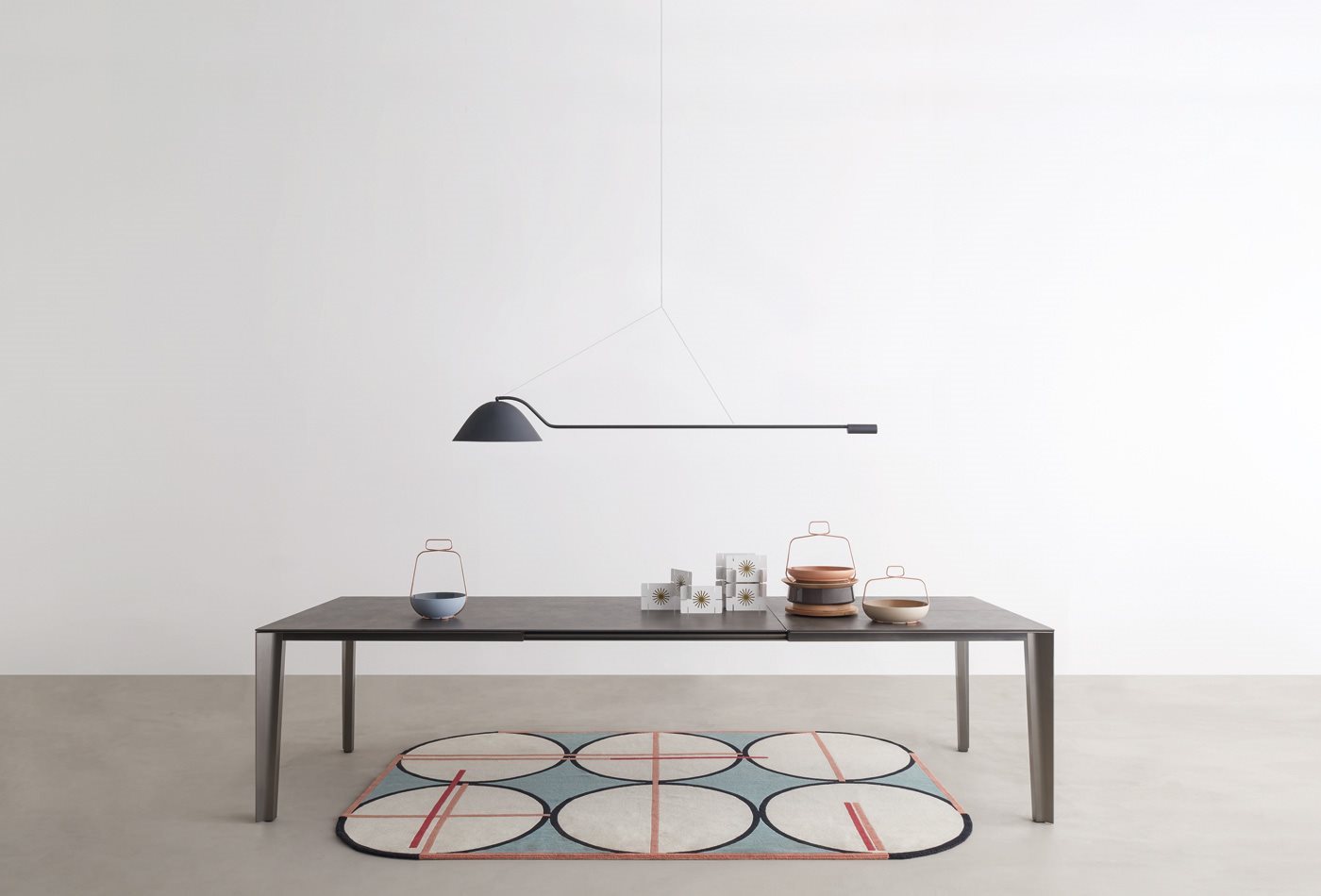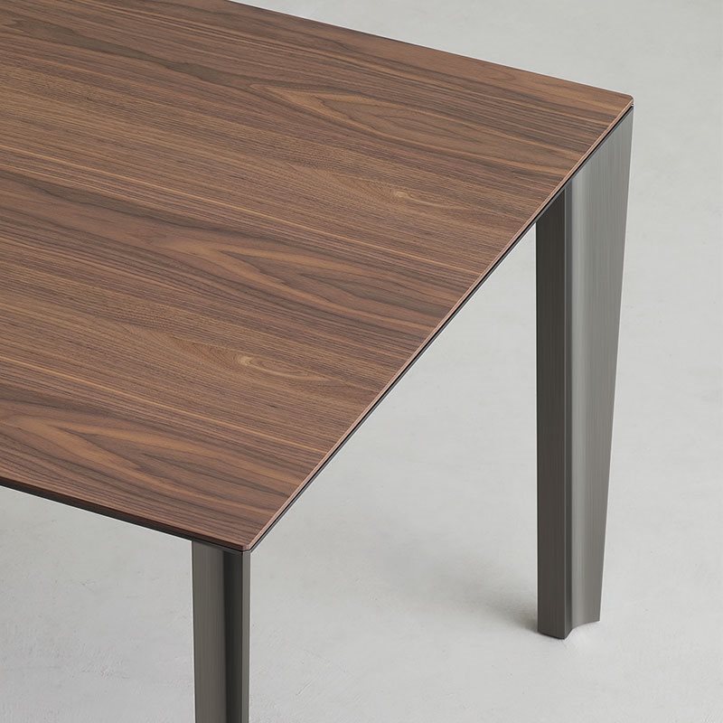 Una superficie lineare e sottilissima nasconde meccanismi sofisticati che permettono di allungare il piano senza perderne l’armonia delle proporzioni. Come se Skin fosse un tavolo all’interno del quale ve ne fosse contenuto un secondo.