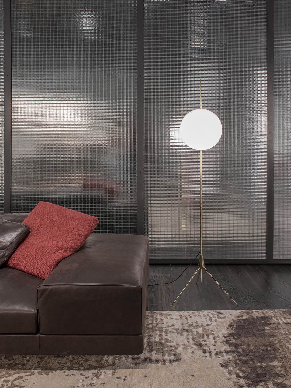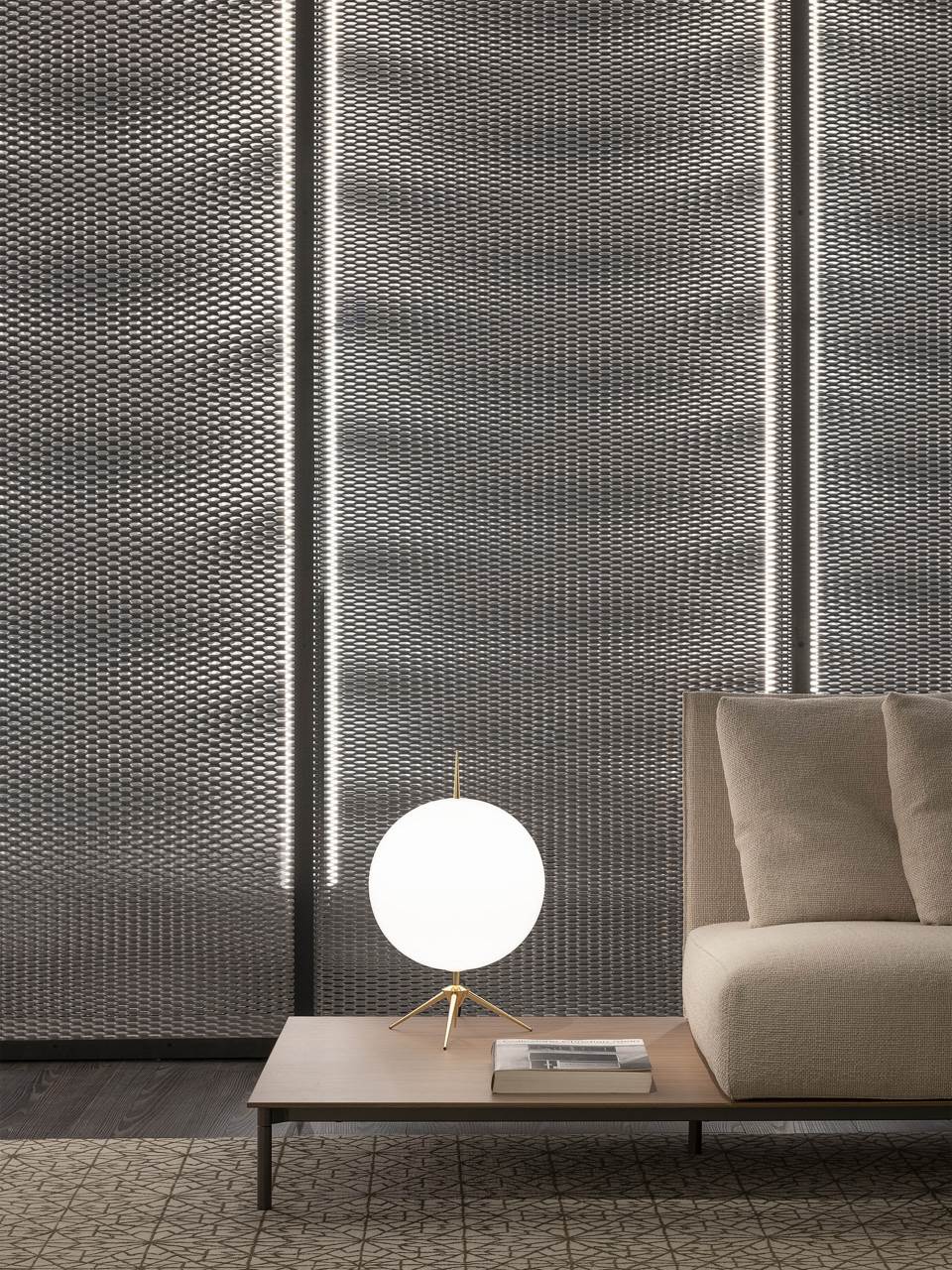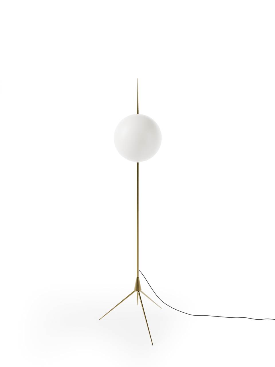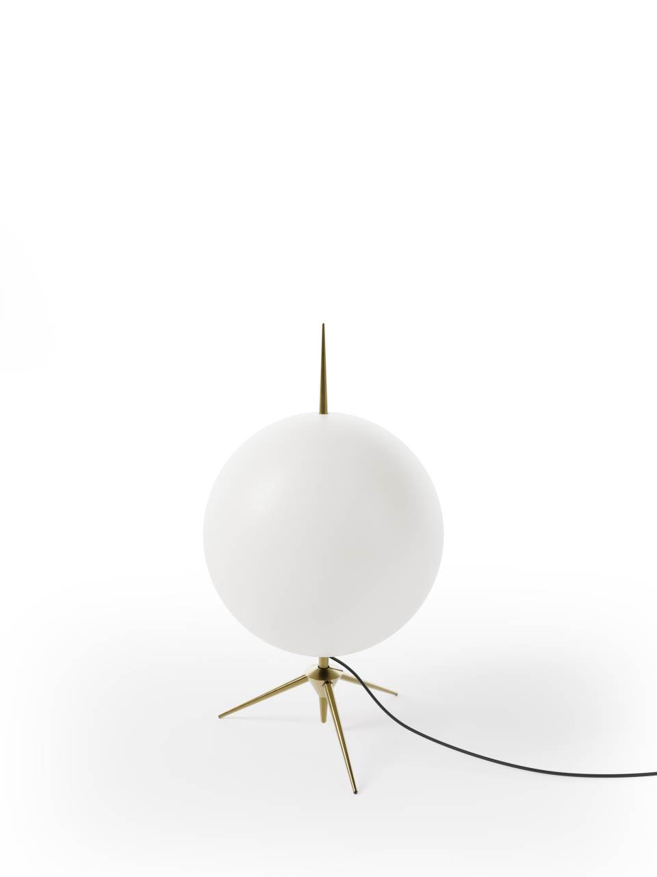 A luminous sphere holded by a thin stem to give an impression of extreme lightness, allowing it to be contemplated as an ephemeral celestial phenomenon.