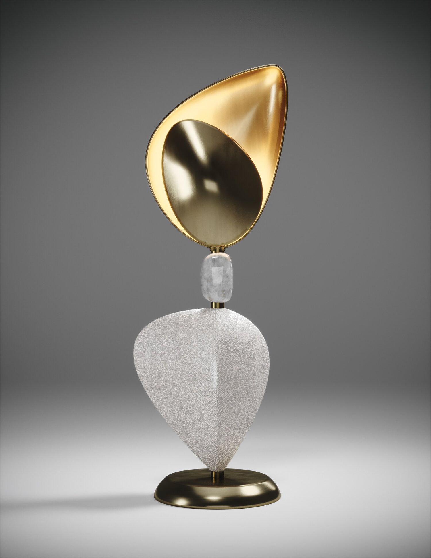 The Cosmo Bird table lamp by Kifu Paris is a whimsical and sculptural piece, inlaid in either cream shagreen and bronze-patina brass with a beautiful quartz piece in the center or completely in bronze-patina brass with a lapis lazuli piece. The amorphous shapes are an abstract and poetic reinterpretation of a bird flying in a cosmic sky. This piece is a part of the Cosmo II Capsule. This piece is designed by Kifu Augousti, the daughter of Ria and Yiouri Augousti. All shagreen pieces are hand-dyed by artisans.