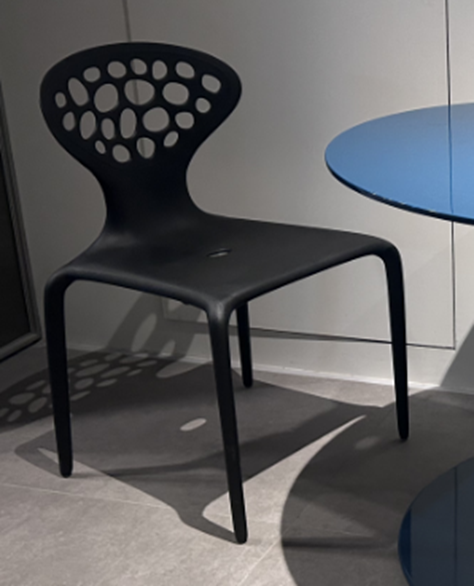 Design polisensoriale, linee da accarezzare, da leggere al tatto e da ri-elaborare continuamente. Le forme sinuose si irradiano dal telaio-struttura allo spazio circostante. Pieni e vuoti, assenze che diventano presenze nell’attraversamento della luce, del vento, del corpo. I fori dello schienale, come uno schermo poroso, creano seducenti giochi di ombre, rimando alle geometrie disegnate dai raggi solari filtrati dalle fronde degli alberi.