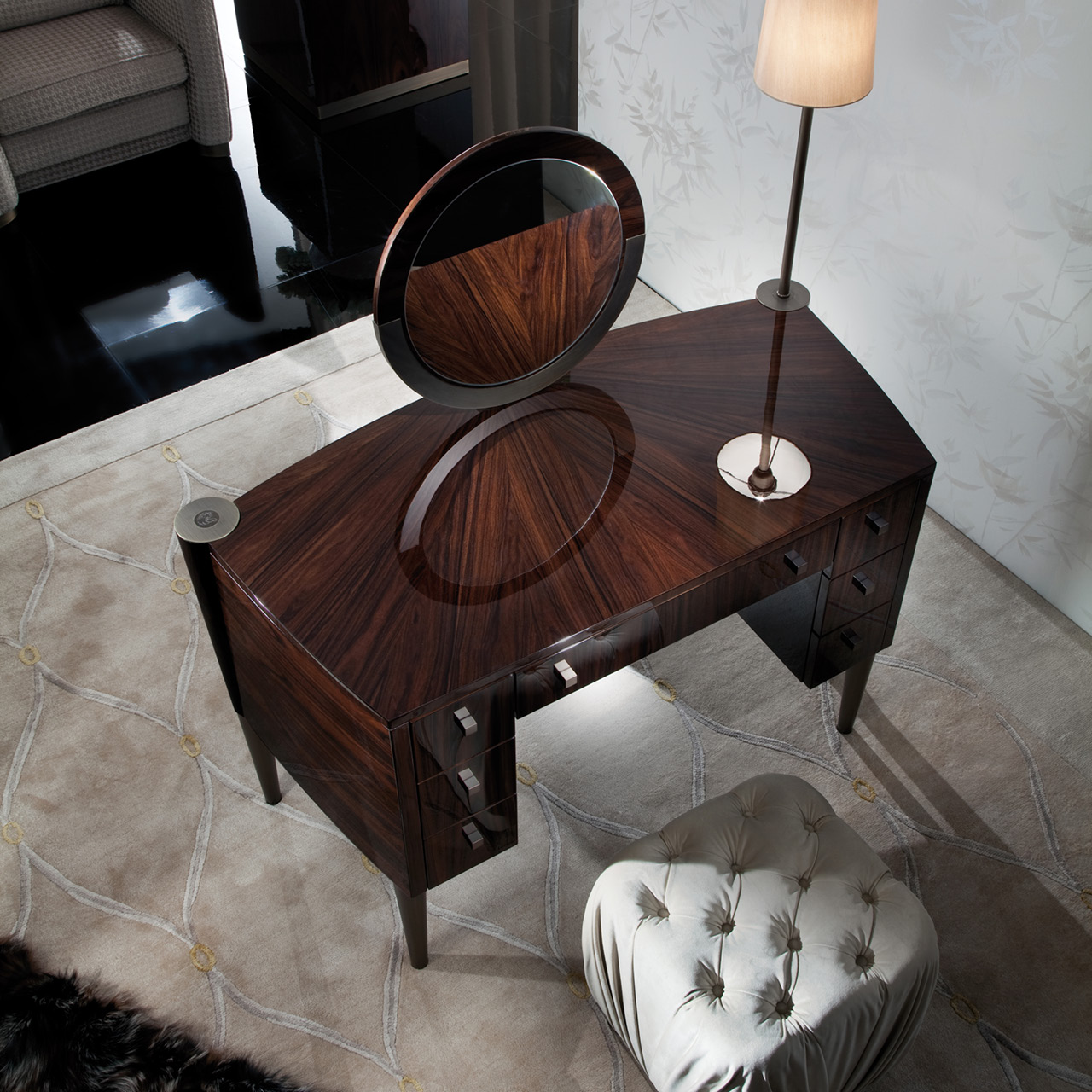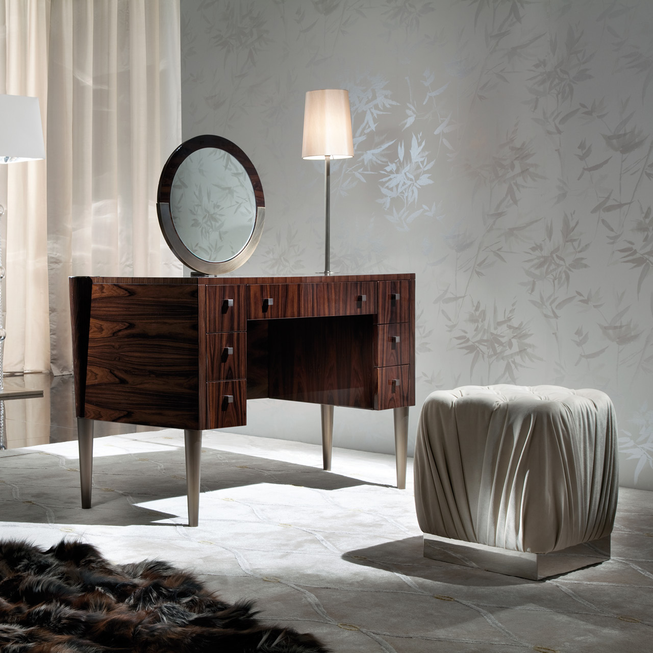 Vanity desk in Brazilian rosewood veneer with high gloss polyester finish. 6 side drawers and 1 center drawer with jewelery dividers with bottom in velvet fabric. Conical legs and details in bronzed stainless steel.